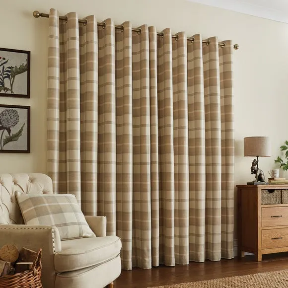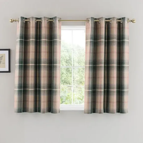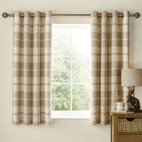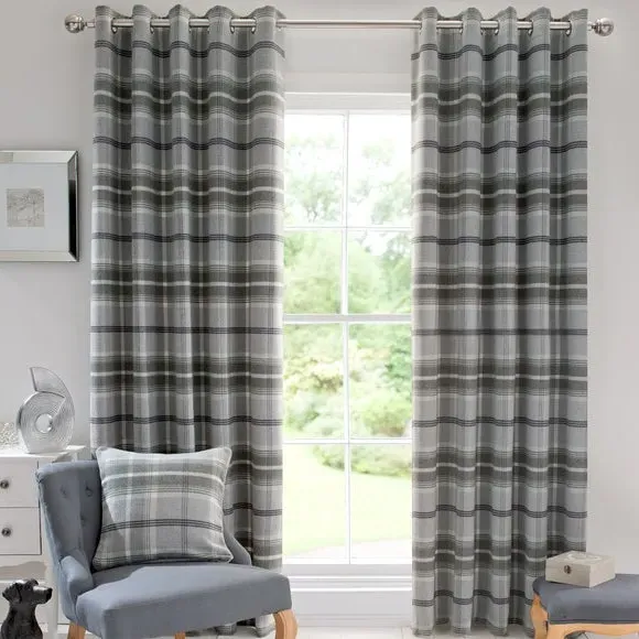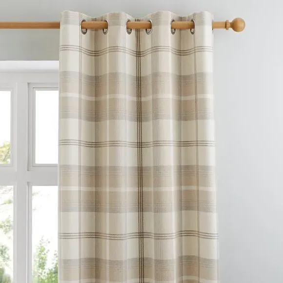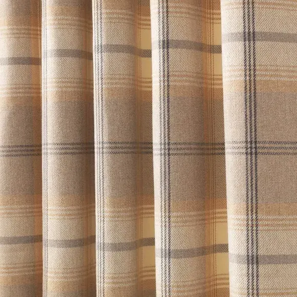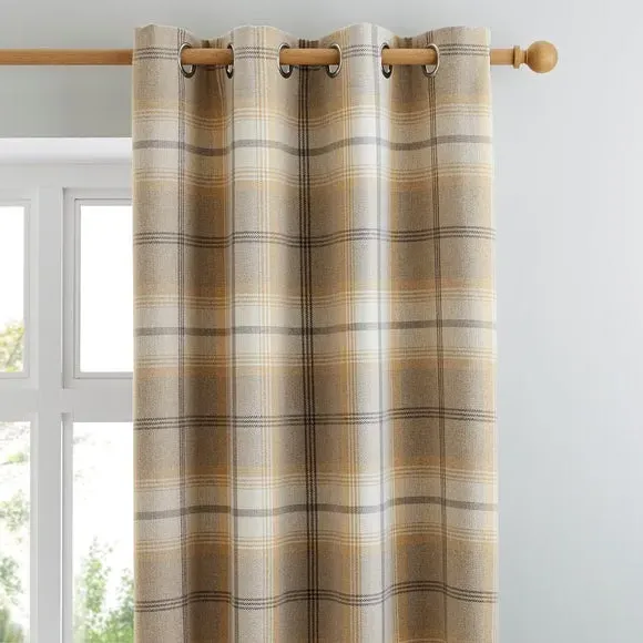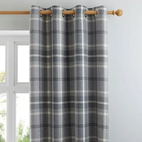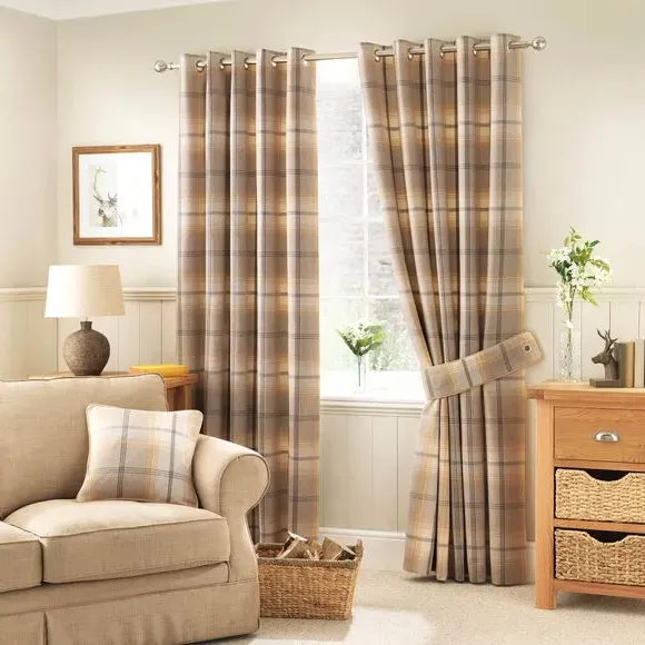The eyelet curtains feature a textured tartan check design crafted from heavyweight yarn with a brushed finish. The fully lined construction provides improved insulation and creates a fuller drape, while the eyelet header allows for easy installation and smooth movement across curtain poles. Each pair includes two panels made from durable materials for enhanced longevity. The modern eyelet design combines functionality with timeless tartan styling.