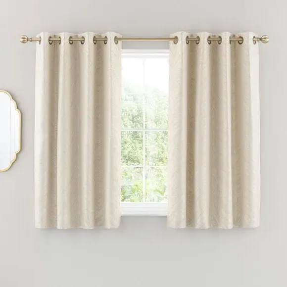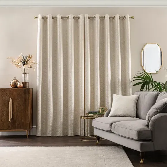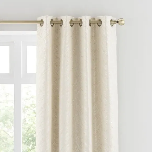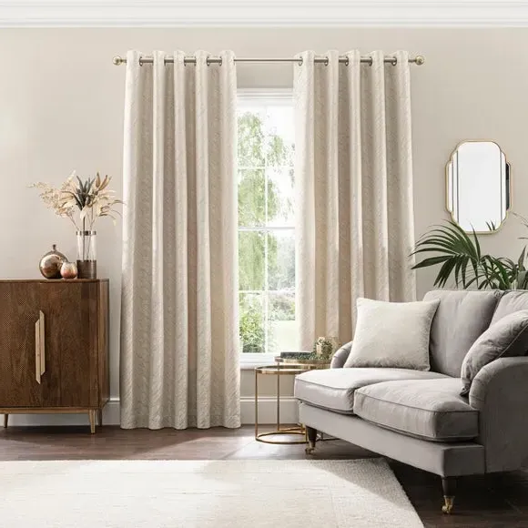 * 1 pair - includes 2x curtain panels* Eyelet Header* Natural Colourway* Available in 9 Sizes* Matching Cushion Available Indulge in the mesmerising beauty of the Flame Eyelet Curtains. Featuring a stunning feathered design set against a natural colourway, these curtains bring a touch of elegance and serenity to your living space. With a modern eyelet header, the Flame Eyelet Curtains offer a seamless and effortless installation process. The eyelets smoothly glide onto your curtain rod, allowing for easy opening and closing. Crafted from recycled material and with meticulous attention to detail, these curtains are fully lined for both aesthetic appeal and practicality. Offering an extra layer of privacy, these curtains improve insulation – keeping your home warm in the colder seasons and cool during the summer, whilst reducing external noise for a more peaceful environment. To complete the cohesive look, the Flame Eyelet Curtains offer a matching cushion cover that is available to purchase separately. This allows you to effortlessly tie together your decor, creating a harmonious and stylish atmosphere throughout your space. The size of the curtains shown is the size of 1 panel, you will receive 2 panels of this size. Choose the width that is closest to your pole length for full look.