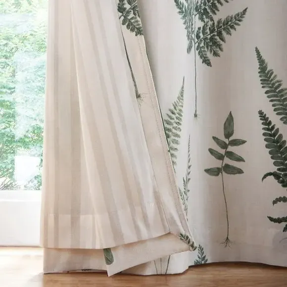 The eyelet curtains feature beautiful fern artwork printed on 100% cotton face fabric, creating a botanical aesthetic. The velvet ribbon edge adds luxurious detail, while the recycled polyester and cotton lining provides extra softness and durability. Each set includes two panels with smart eyelet headers for easy hanging, and the striped lining adds subtle texture from behind.