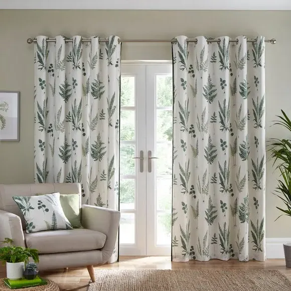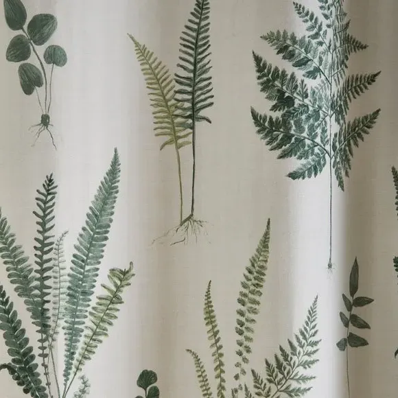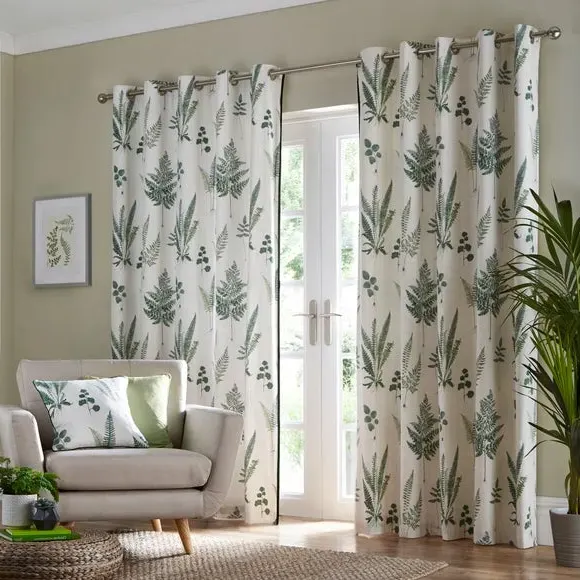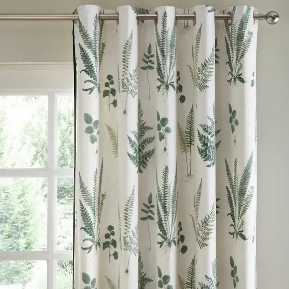 * Includes 2 x curtain panels* Printed Beautiful Leaf Artwork Design* 100% Cotton Face Fabric* Velvet Ribbon Edge for Added Detail* 52% Recycled Polyester & 48% Cotton Lining* Lining is Printed with a Stripe* Available in 9 Sizes* Matching Cushion Available* Smart Eyelet Header The Fern Eyelet Curtains are printed with beautiful leaf artwork and will make any room look like a botanical sanctuary. The 100% cotton face fabric is paired with 52% recycled polyester and 48% cotton lining—for a touch of extra softness. The velvet ribbon at the leading edge adds more detail for a luxurious finish. This product is OEKO-TEX MADE IN GREEN certified, meaning it was produced in OEKO-TEX S Te P certified factories - verifying environmental, social, and chemical standards in the facility. It has also been certified to OEKO-TEX STANDARD 100, the original safety standard for everyday confidence. To offer full visibility, the production stages throughout the supply chain can be traced.