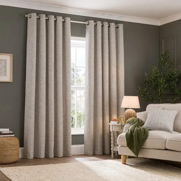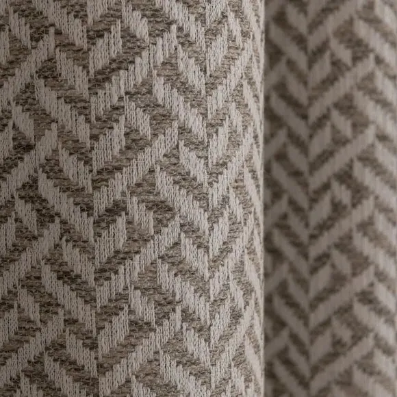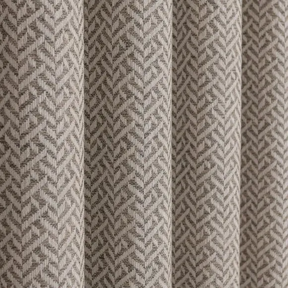 The curtains feature a sophisticated geometric herringbone weave that provides exceptional drape and texture. With its fully lined construction, the fabric offers enhanced privacy and light control, while the brushed silver eyelet header allows for easy hanging. The set includes two curtain panels that combine contemporary style with practical functionality.