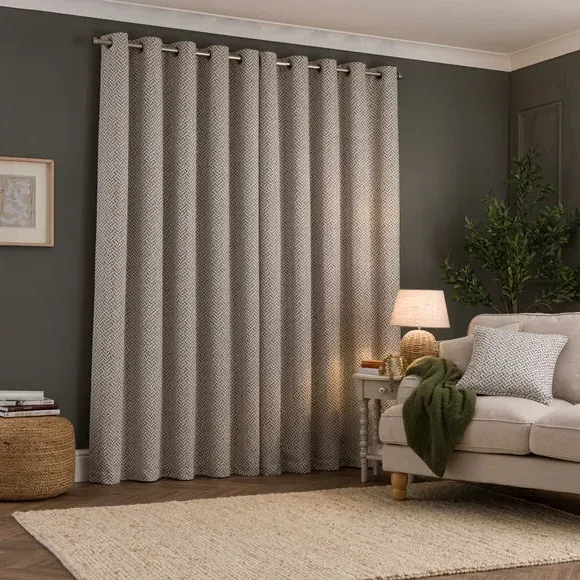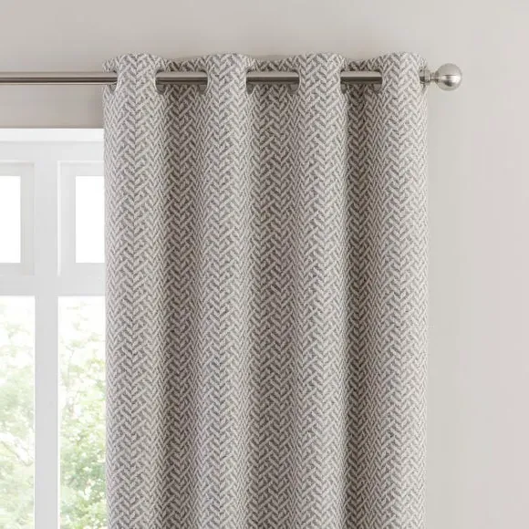 * Includes 2 x curtain panels* Geometric woven design* Fully lined* Eyelet header Add contemporary charm to your home with the Bennett Eyelet Curtains. Featuring a sophisticated geometric design in a chic Herringbone weave, these fully lined curtains offer exceptional drape and texture. The brushed silver eyelet header allows for easy hanging, and coordinating cushions help complete a unified interior look.