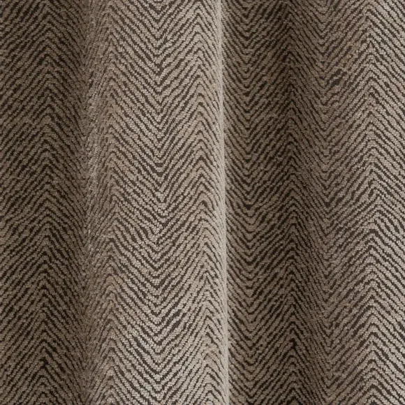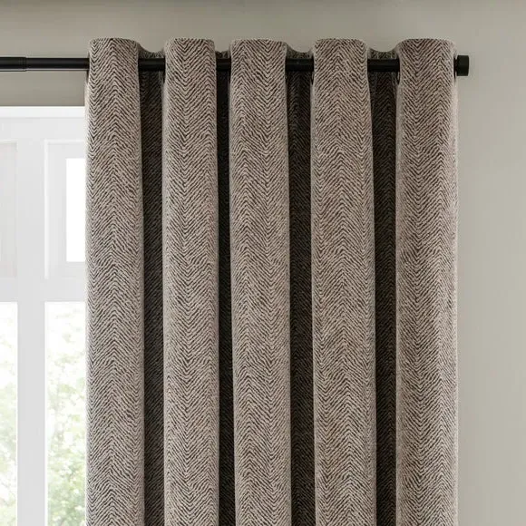 The curtains feature luxurious chenille fabric woven in a modern herringbone design, creating beautiful drape and textural appeal. Each pair includes two panels with eyelet headers that provide easy installation and smooth movement across curtain poles. The recycled polyester construction offers durability, while the full lining adds longevity and light control.