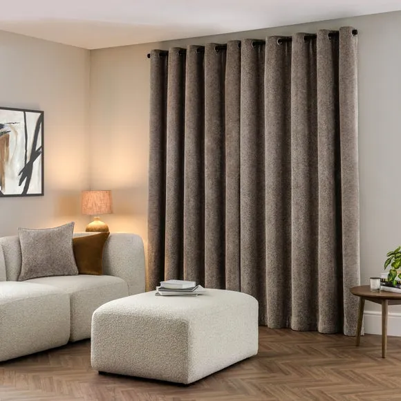 * Includes 2 x Curtain panels* Stylish and sumptuous herringbone chenille fabric* Eyelet header* Available in a range of sizes* Co-ordinating cushion available The Tabitha curtains are made from a luxurious and sumptuously soft chenille fabric woven in a modern herringbone design. The textural feel and beautiful drape make this pair of curtains perfect for complementing a wide variety of decorative styles. Finished with an eyelet header for easy installation and smooth movement across your curtain pole, these curtains are made from 100% recycled polyester and fully lined for longevity. Style with the coordinating cushion to complete the look.