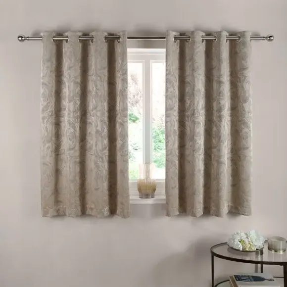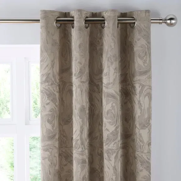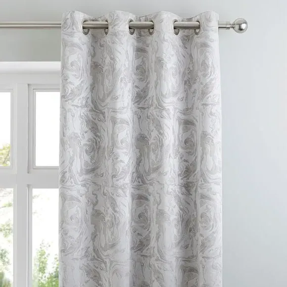 The curtains feature a marbled effect weave with fully lined construction for enhanced light control and privacy. The modern eyelet header provides smooth operation while adding contemporary style to the design. Each pair includes two panels with matching hardware, and the lined backing offers improved drape and durability.