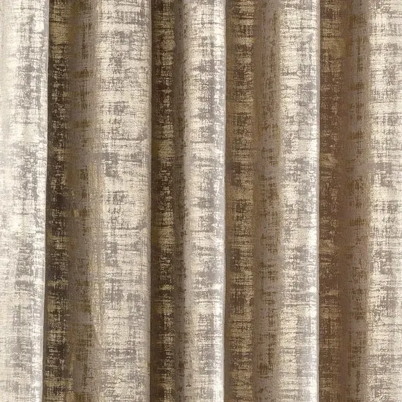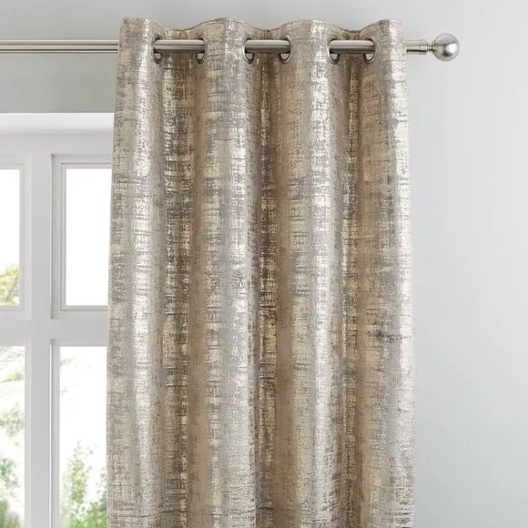 * 1 pair - includes 2x curtain panels* Metallic print design* Luxurious soft feel* Polyester lining to preserve face fabric* Modern eyelet header A rich, luxuriously soft feel fabric has been adorned with a metallic print, perfect for giving your home interior a glamorous look. The polyester lining will help preserve the design and front fabric from fading, making these curtains long-lasting. Complete with a modern eyelet header, these curtains are designed for use with a curtain pole. Coordinate the curtains with the matching cushion for a stylish room look. The size of the curtains shown is the size of 1 panel, you will receive 2 panels of this size. Choose the width that is closest to your pole length for full look.**Please note:** Pattern matching can not be guaranteed across multiple pairs of curtains. Please note: We are unable to deliver this item to Scottish Highlands/remote areas.
