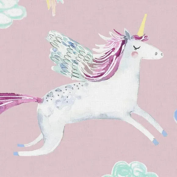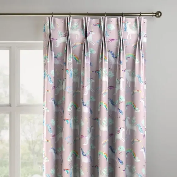 This full of life design has been digitally printed on 100% cotton and gives centre stage to a pretty, playful unicorn and rainbow design on a complementing light pink ground. Its wonderful patterns and colours inspire a creative and imaginative atmosphere, perfect for the little ones or a child at heart. Our Web Exclusive Little Adventurers range features 5 playful, unique designs for curtains, upon a 100% cotton fabric base, and includes a wide range of styles. Introducing imagination and creativity into your décor, with designs like Zoo, Unicorn, Jurassic and Hot Air Balloon, will inspire younger minds, and create unique, playful spaces in any room. 100% natural fibres like cotton are kinder to the environment, as well as to our skin, being naturally hypoallergenic, meaning they are ideal for sensitive and allergy-prone skin, as well as having unique anti-bacterial qualities. You can feel confident that our Little Adventurers’ range will be gentle to the environment and inspire the minds of those who find stories within their designs. Please note: you measure for pinch pleat curtains in the same way as pencil pleat curtains**Online Only:**This product is only available to order online. Our expert virtual consultants can provide advice on measuring/fitting and style tips and our free samples can be ordered online to be delivered straight to your home to help you choose a fabric that's right for you. Once you're happy, simply place your order online and we'll do the rest. Please note: If your measured width is over 124cm your curtains will come with a fabric join to provide the full width required.