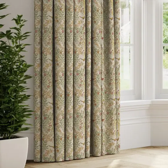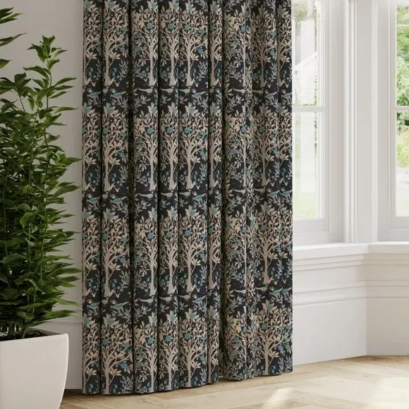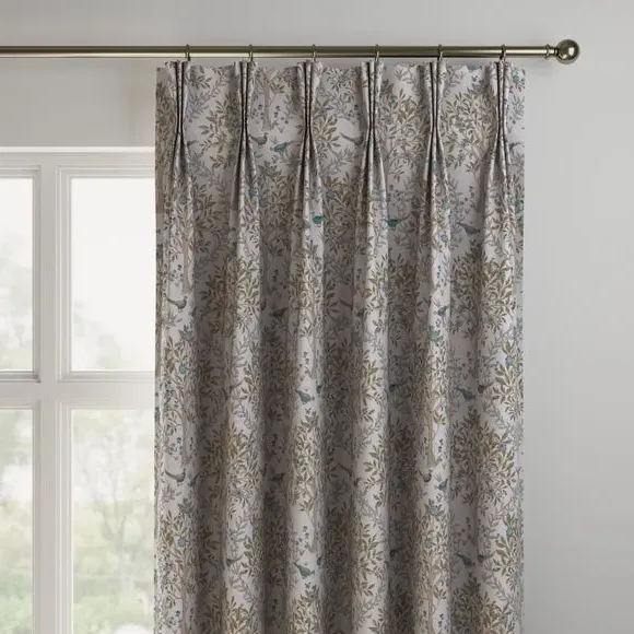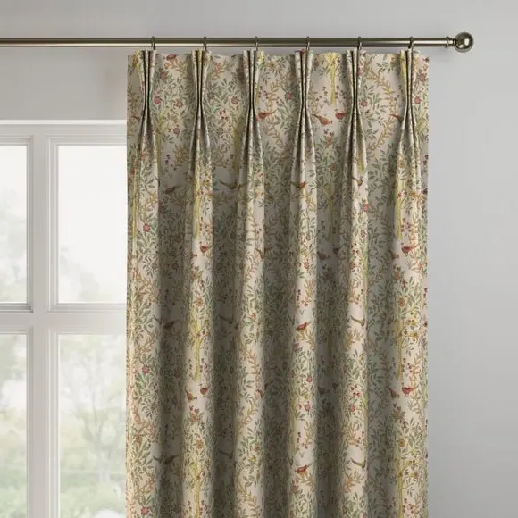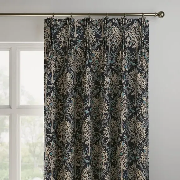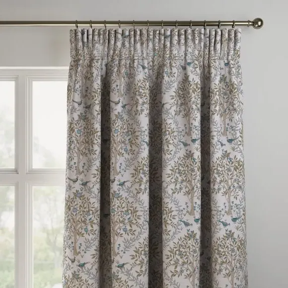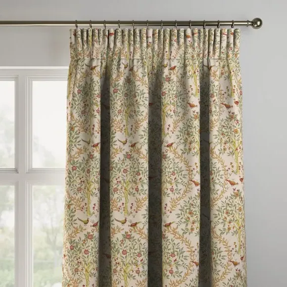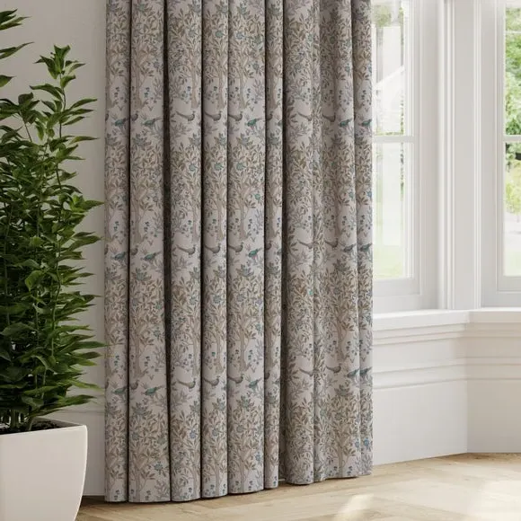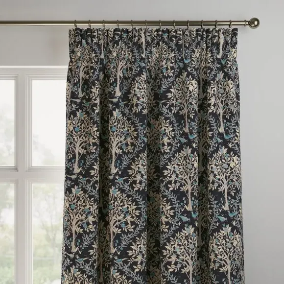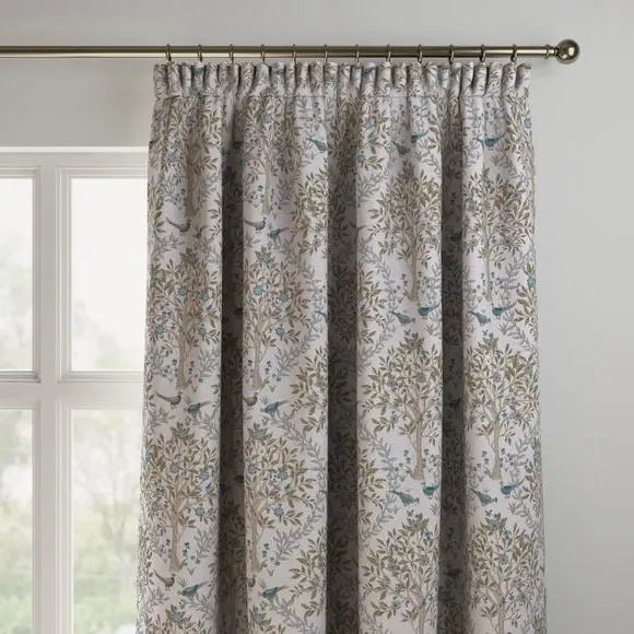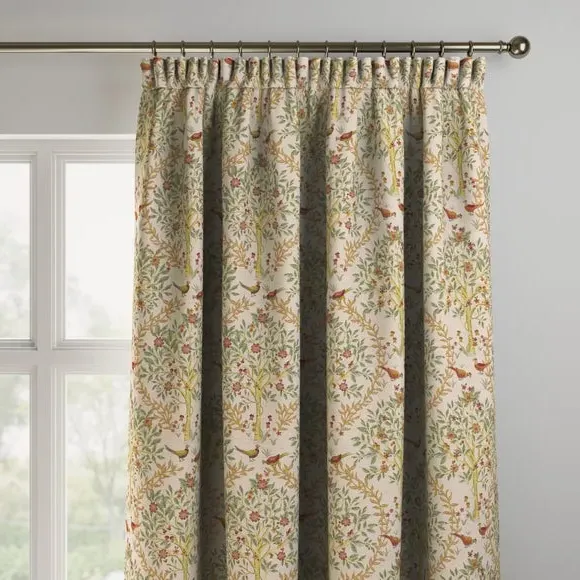 * Made with sustainable materials - 100% recycled polyester* Selection of header types available* Choice of linings options available* Made to your measurements!* Sold as a pair Infuse your home with a sense of tranquillity and natural beauty with this intricate Bedgebury fabric. Crafted from jacquard material, this fabric showcases a classic bird and trees design that exudes timeless charm. This fabric will add a welcoming touch and a pop of colour to any living space.**Choosing your lining:**Blackout provides minimal light disturbance in your home making it perfect for bedrooms. Thermal helps to keep the warmth in and the cool air out meaning it’s great for family rooms or lounges. Our Standard Lining is perfect if you like the glow of natural light whilst your curtains are closed whilst still maintaining your privacy. Please note: you measure for pinch pleat curtains in the same way as pencil pleat curtains Please note: If your measured width is over 124cm your curtains will come with a fabric join to provide the full width required.