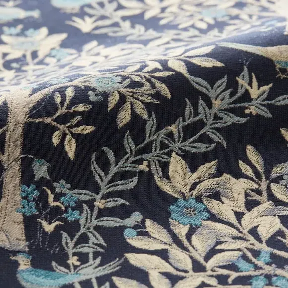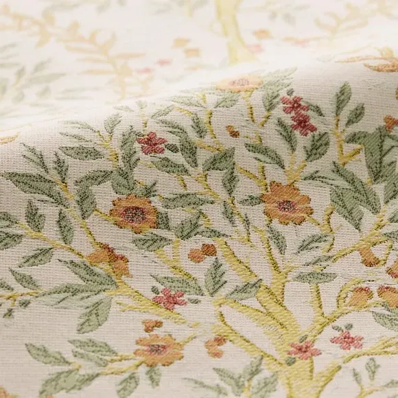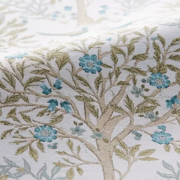 The curtains feature a classic bird and trees design crafted from sustainable jacquard material made with 100% recycled polyester. Multiple header types and lining options provide customization, while the made-to-measure service ensures a precise fit. Blackout lining offers minimal light disturbance, thermal lining helps regulate temperature, and standard lining maintains privacy while allowing natural light. The curtains are sold as a pair with fabric joins added for widths over 124cm.