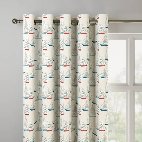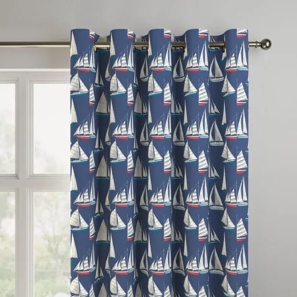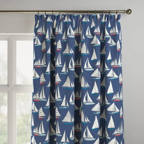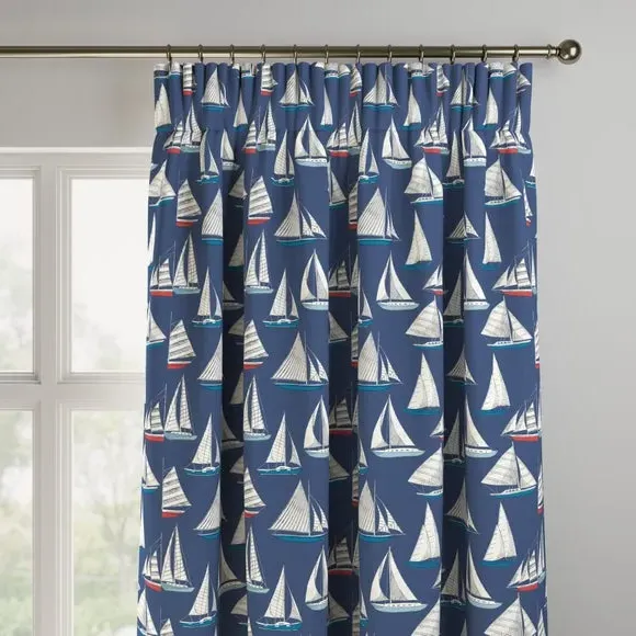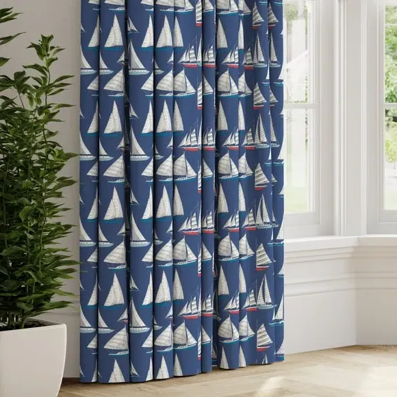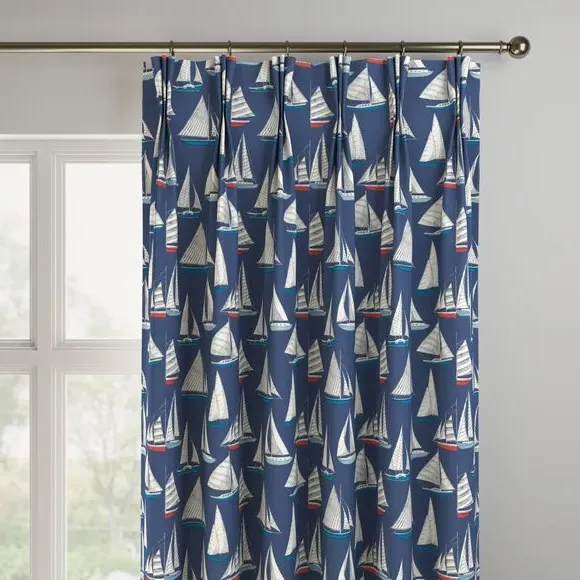 A regatta of sailing yachts are beautifully presented across a 100% cotton fabric in a rich navy or unintrusive pale background to suit your style and home. Featuring classic coastal colours, this print is inspired by holidays on the Devon coast to inspire a calming nautical atmosphere into the home. Our Web Exclusive Coastal range features 9 beautiful, unique designs for curtains, upon a 100% cotton fabric base, and includes a wide range of styles. Introducing bright and breezy seaside designs into your décor, like Lundy, Gulls, Ocean Yatch, Clovley, Salcombe Stipe and Seaton Stripe, will create a stunning, colourful focal point in any room. 100% natural fibres like cotton are kinder to the environment, as well as to our skin, being naturally hypoallergenic, meaning they are ideal for sensitive and allergy-prone skin, as well as having unique anti-bacterial qualities. You can feel confident that our Coastal range will be gentle to the environment, and to those who may sit close. Please note: you measure for pinch pleat curtains in the same way as pencil pleat curtains**Online Only:**This product is only available to order online. Our expert virtual consultants can provide advice on measuring/fitting and style tips and our free samples can be ordered online to be delivered straight to your home to help you choose a fabric that's right for you. Once you're happy, simply place your order online and we'll do the rest. Please note: If your measured width is over 124cm your curtains will come with a fabric join to provide the full width required.
