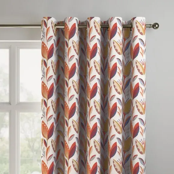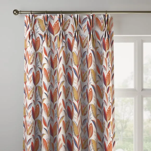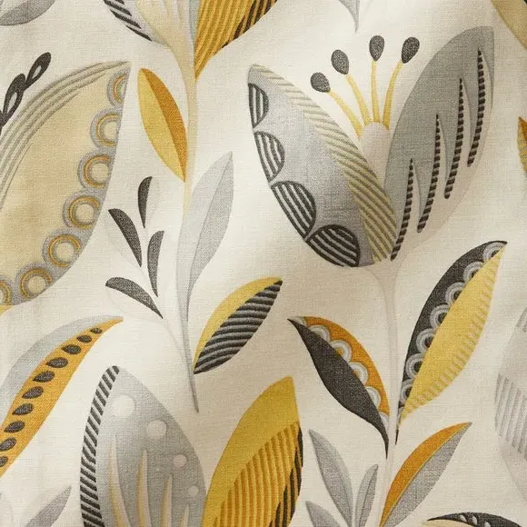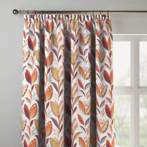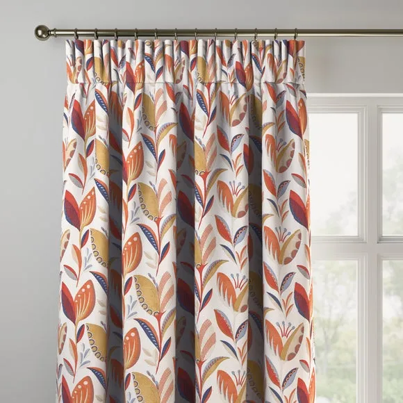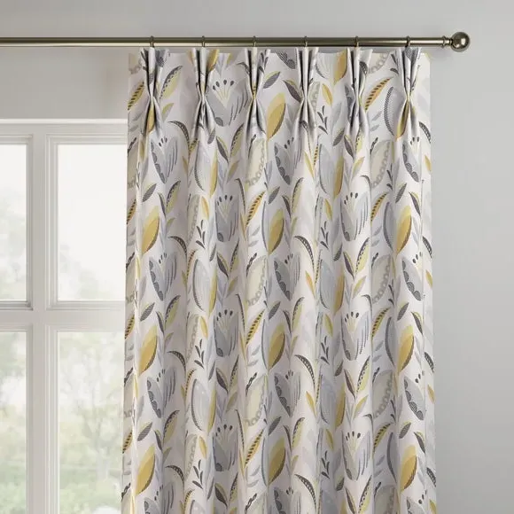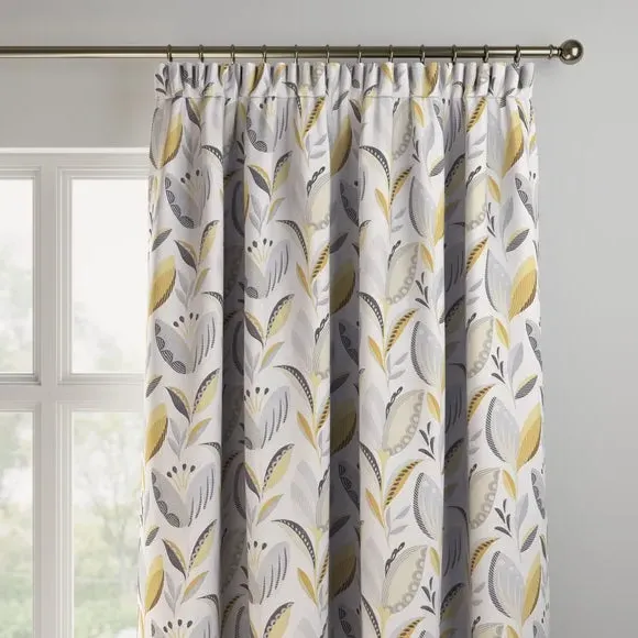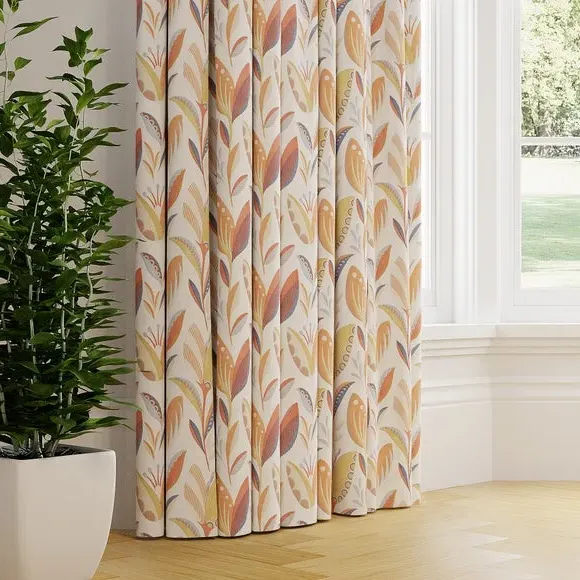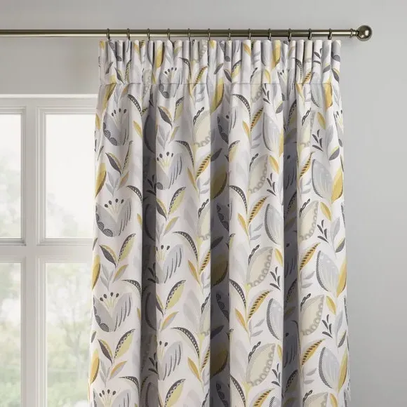The curtains feature an elegant floral design with vibrant ochre tones. Custom-made to your exact measurements, they offer both pinch pleat and pencil pleat hanging options. The fabric construction ensures a tailored fit, while widths over 124cm include a discreet fabric join for full coverage.