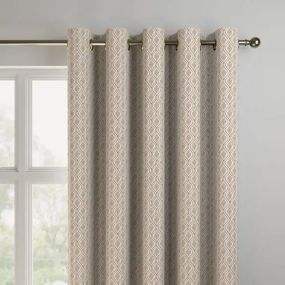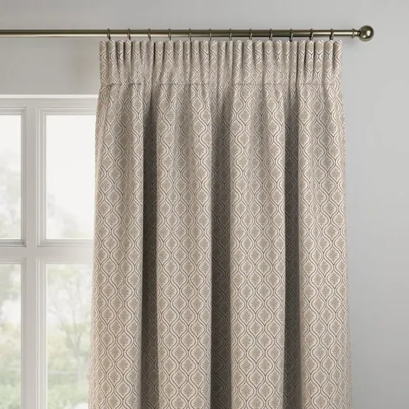 The curtains feature a geometric leaf design crafted from a cotton and linen blend. Multiple header options include eyelet and pinch pleat styles, while lining choices range from blackout to thermal for enhanced functionality. The made-to-measure service allows customization to fit your specific window dimensions, with fabric joins added for widths over 124cm to achieve the required coverage.