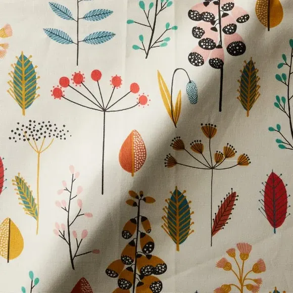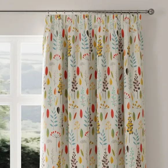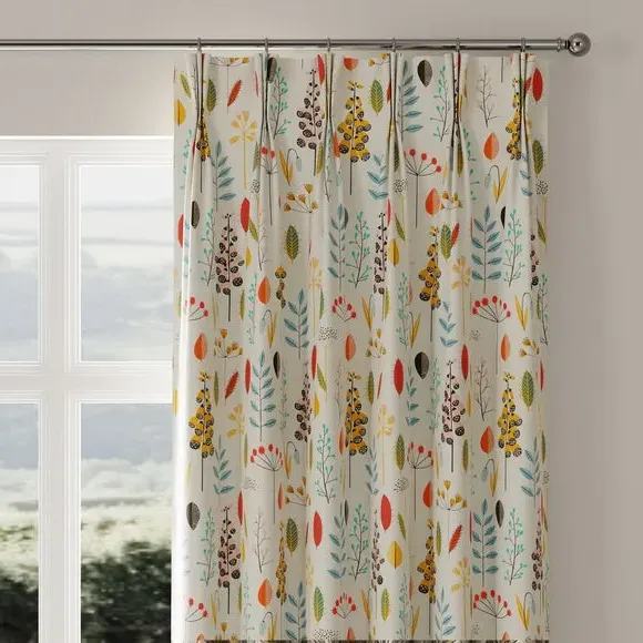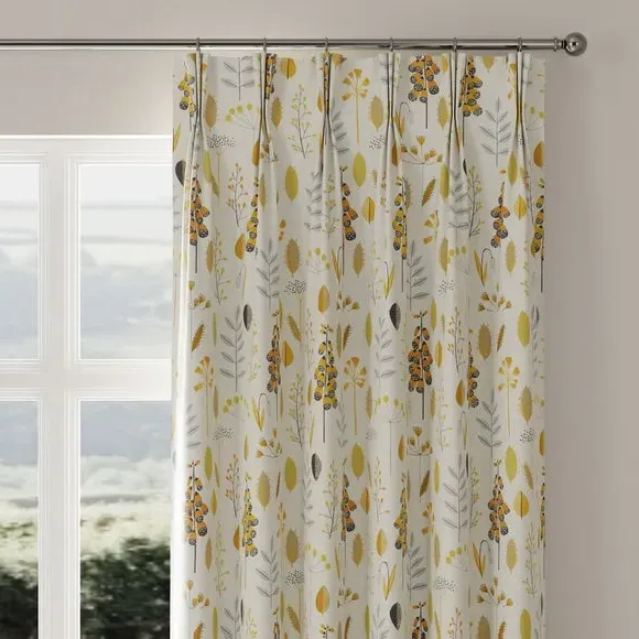 The curtains feature Scandinavian leaves and floral design with elegant styling. The made-to-measure service ensures a custom fit, while pinch pleat construction provides structured hanging. Fabric joins are included for widths over 124cm to achieve the required coverage.