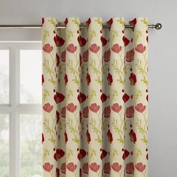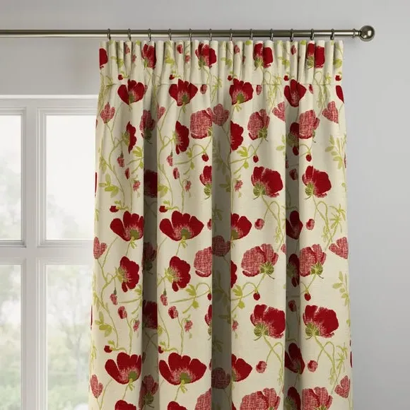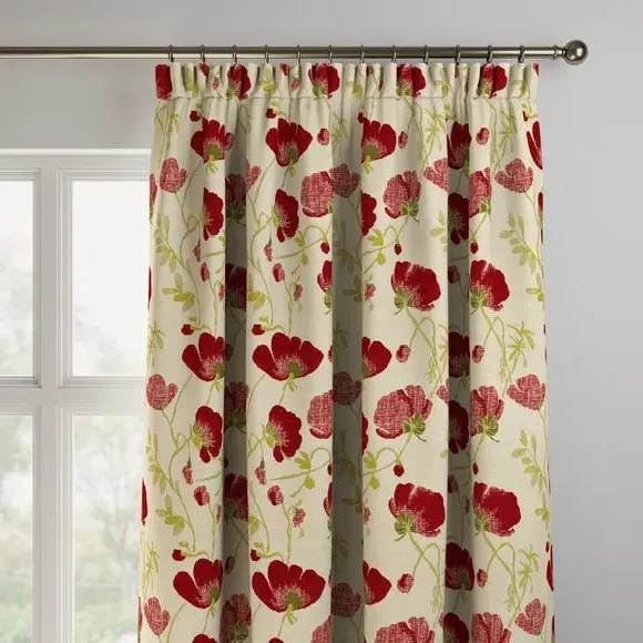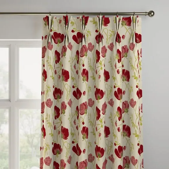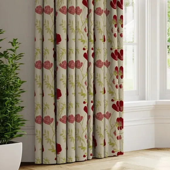 The curtains feature an elegant floral design with custom sizing to fit your windows precisely. Each panel is crafted with pinch pleat or pencil pleat heading options, while the rouge colorway adds warmth to any space. The made-to-measure service ensures proper fit, and panels over 124cm width include fabric joins for full coverage.