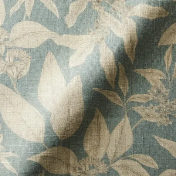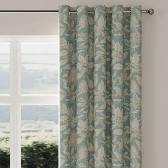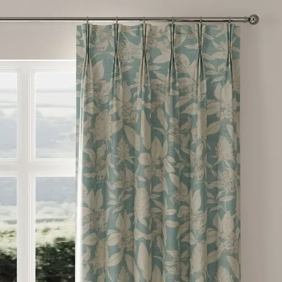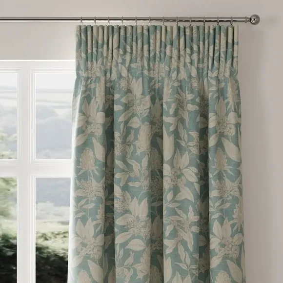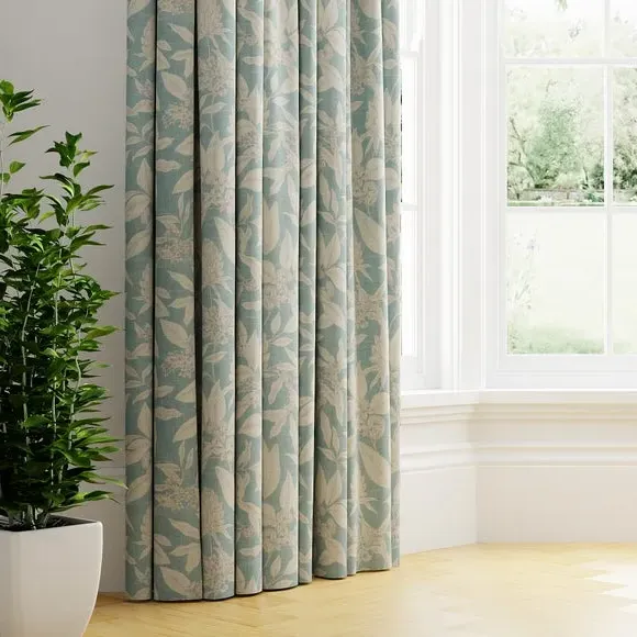 The curtains feature an elegant botanical floral design with fine line detailing. The made-to-measure service ensures a custom fit, while the seafoam color adds a fresh accent to any space. Pinch pleat or pencil pleat heading options provide versatile hanging styles, and fabric joins accommodate wider windows over 124cm.