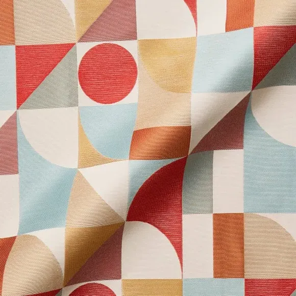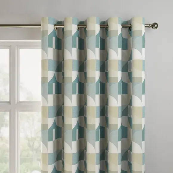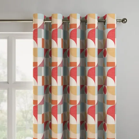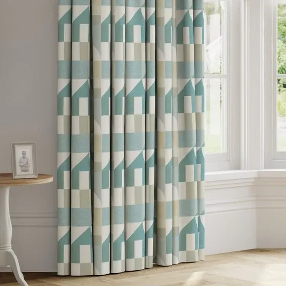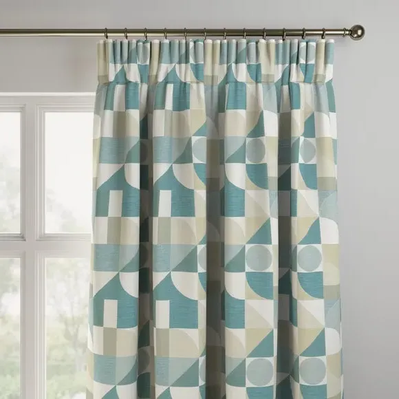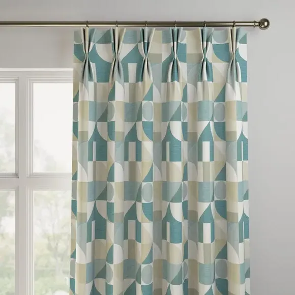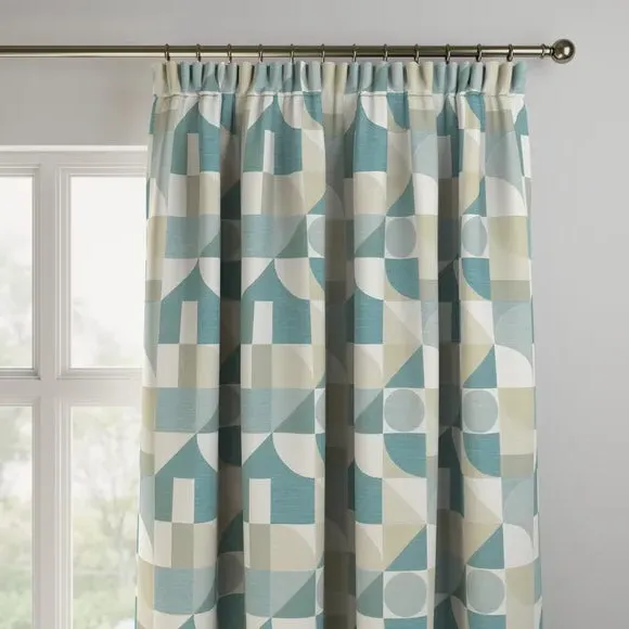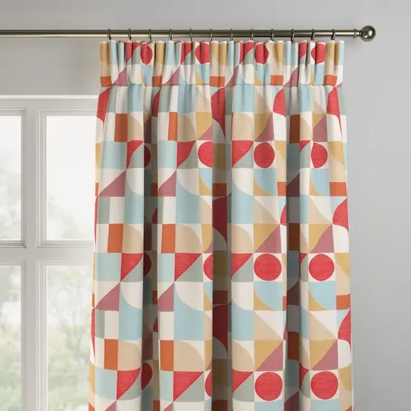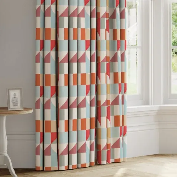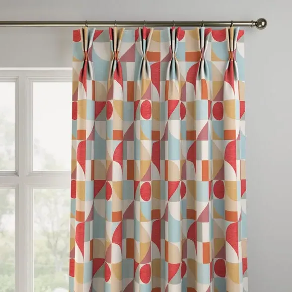 The curtains feature an elegant geometric design with vibrant color accents. Custom-made to your exact measurements, they offer a tailored fit for any window. The fabric construction provides durability and style, while the pinch pleat heading creates structured folds. Widths over 124cm include fabric joins to achieve the required coverage.