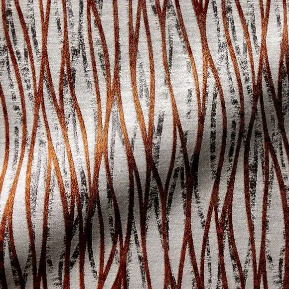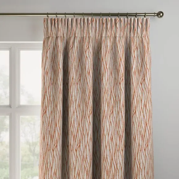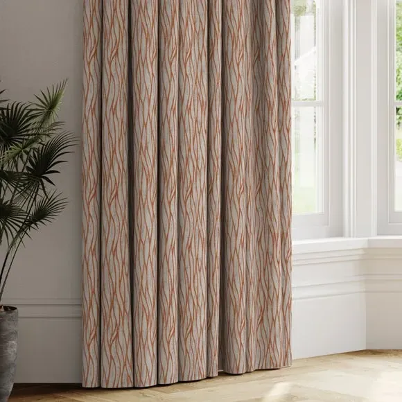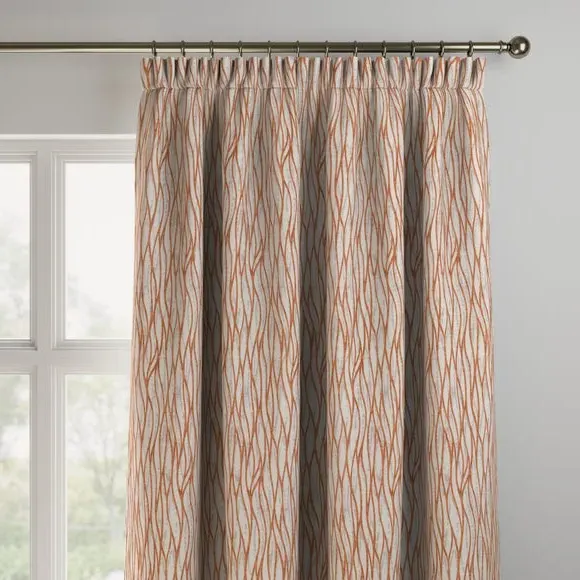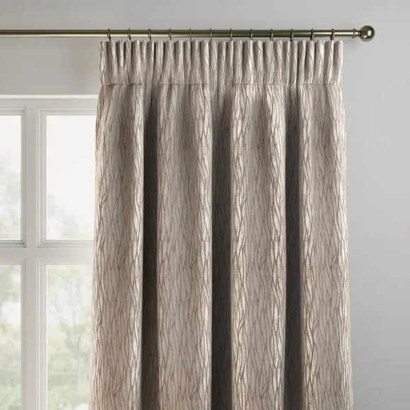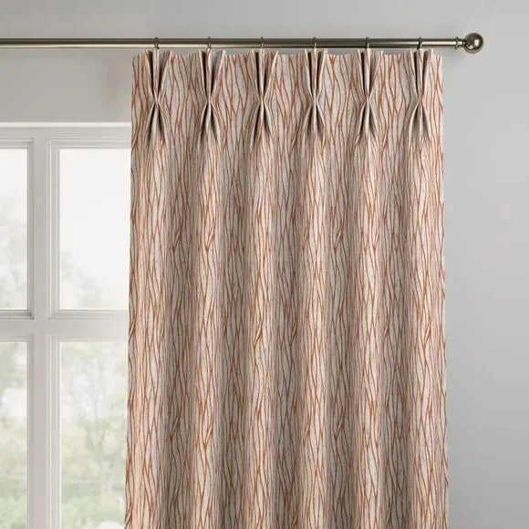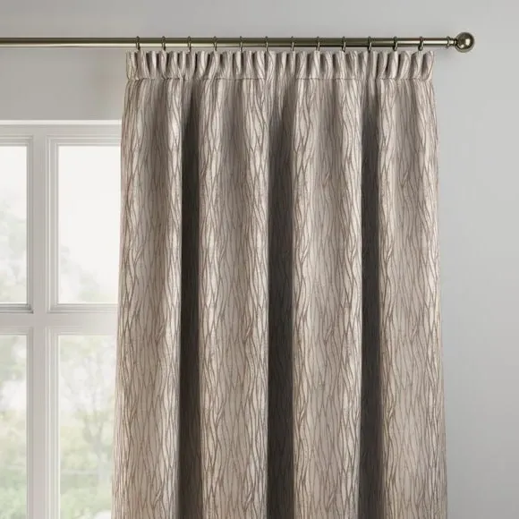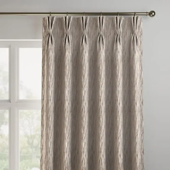 The curtains feature an elegant metallic design with custom sizing to fit your windows precisely. Each panel combines sophisticated linear patterns with professional tailoring, while the made-to-measure service ensures optimal coverage. The pinch pleat heading provides structured draping, and widths over 124cm include fabric joins for seamless full-width coverage.