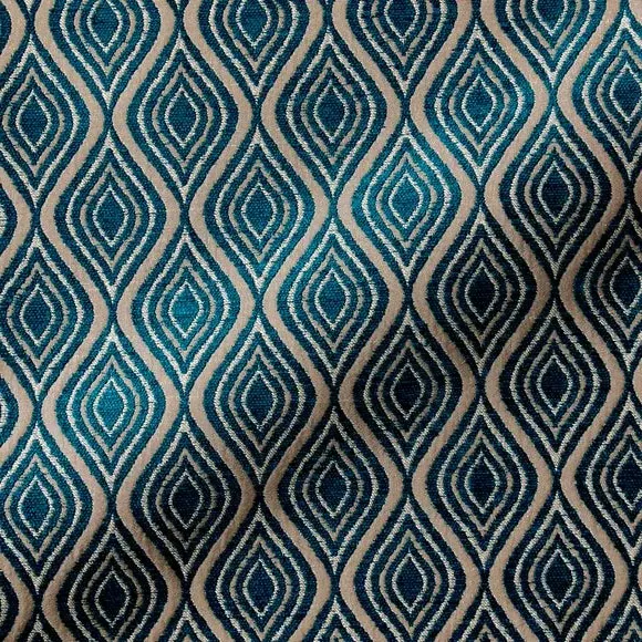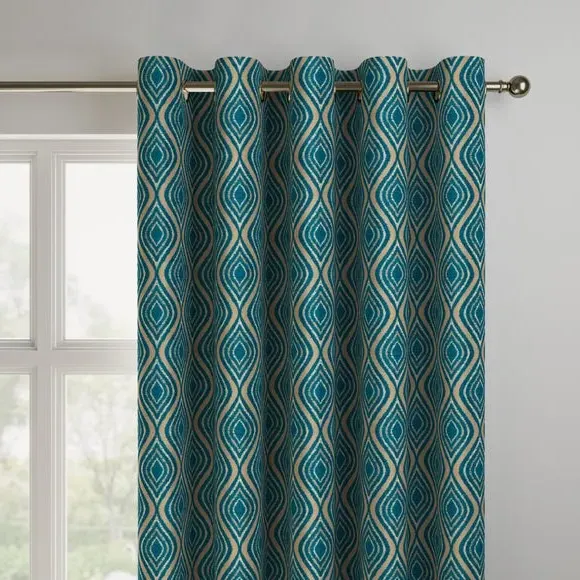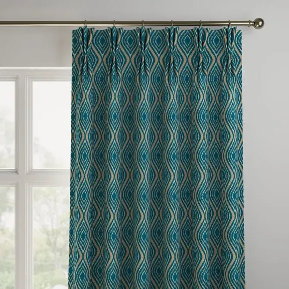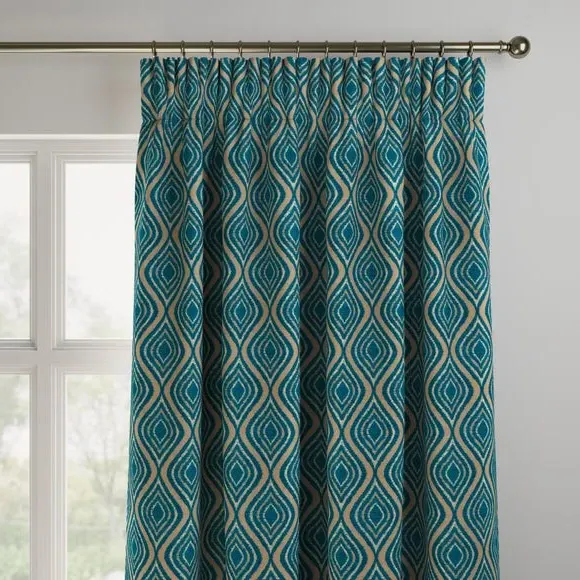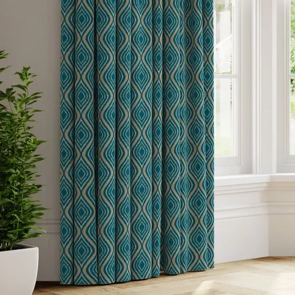 The curtains feature an elegant patterned design with sophisticated teal tones. Custom measuring ensures a precise fit for your windows, while pinch pleat construction provides structured hanging and refined drape. Professional consultation guides you through the ordering process, and fabric joins accommodate wider windows over 124cm for complete coverage.