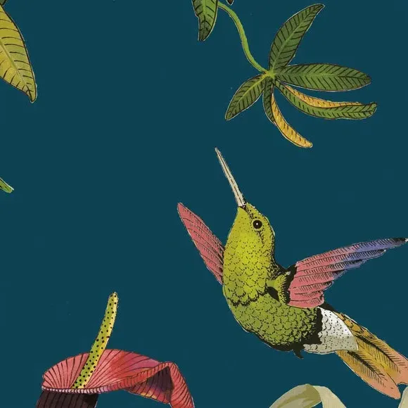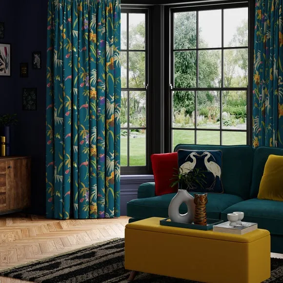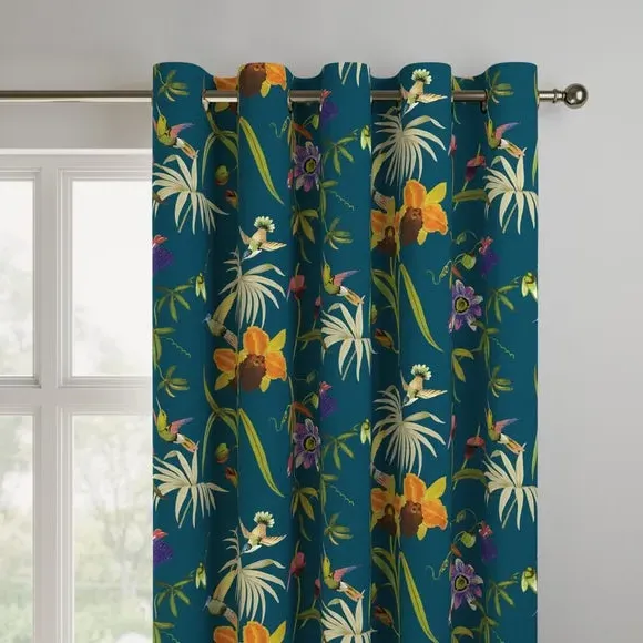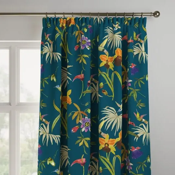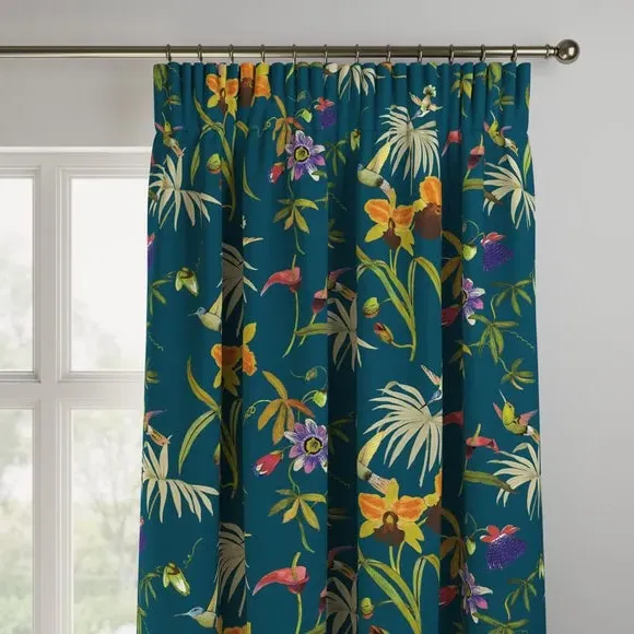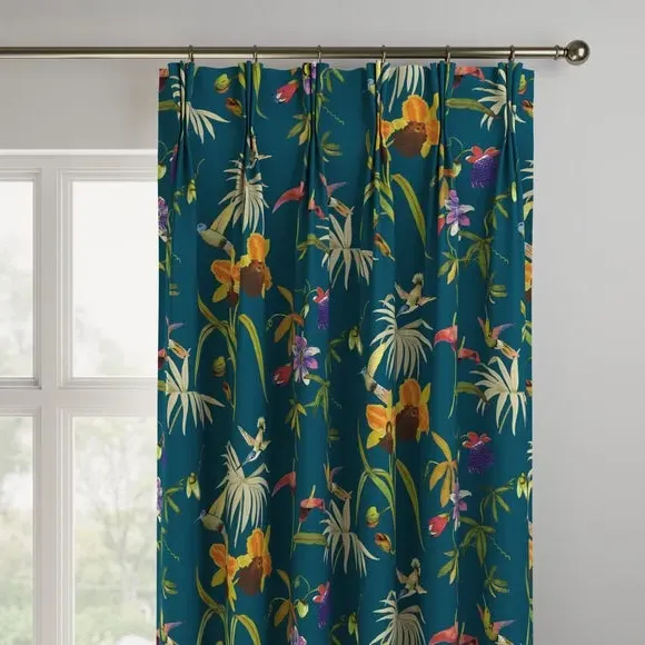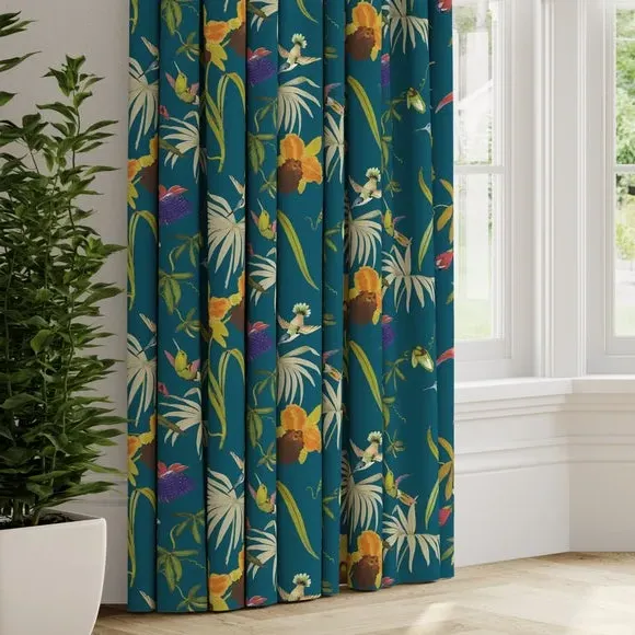 This digitally printed statement fabric features flying hummingbirds and a variety of beautiful, colourful Passiflora flowers on an opulent teal ground and luxe, soft velvet fabric. This full of life print adds a stunning statement to your home. Our Web Exclusive Maximalist range features 12 stunning, unique designs for curtains, upon a beautiful velvet fabric base, and includes a wide range of styles. Introducing wildlife and storytelling into your décor, with designs like Bengal, Cockatoo, Wagtail and Passion, will create a stunning focal point in any room. Inspired by nature, Maximalist also includes ‘full of life’ wildflower scenery fabrics such as Magnolia, Iris, Jacobean, Tropical and Palm. Displaying bright and wonderful colours upon soft velvet fabric bases will add drama and movement to any room. Please note: you measure for pinch pleat curtains in the same way as pencil pleat curtains**Online Only:**This product is only available to order online. Our expert virtual consultants can provide advice on measuring/fitting and style tips and our free samples can be ordered online to be delivered straight to your home to help you choose a fabric that's right for you. Once you're happy, simply place your order online and we'll do the rest. Please note: If your measured width is over 124cm your curtains will come with a fabric join to provide the full width required.