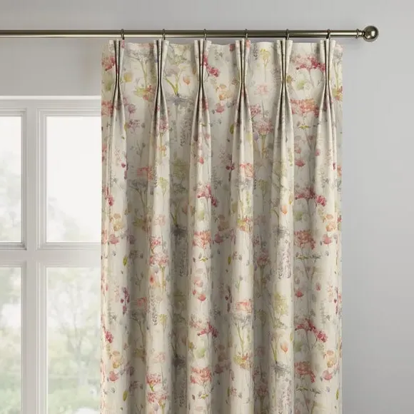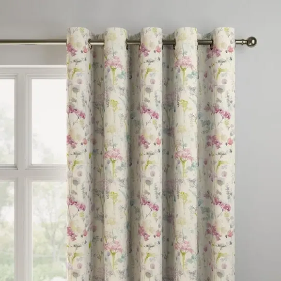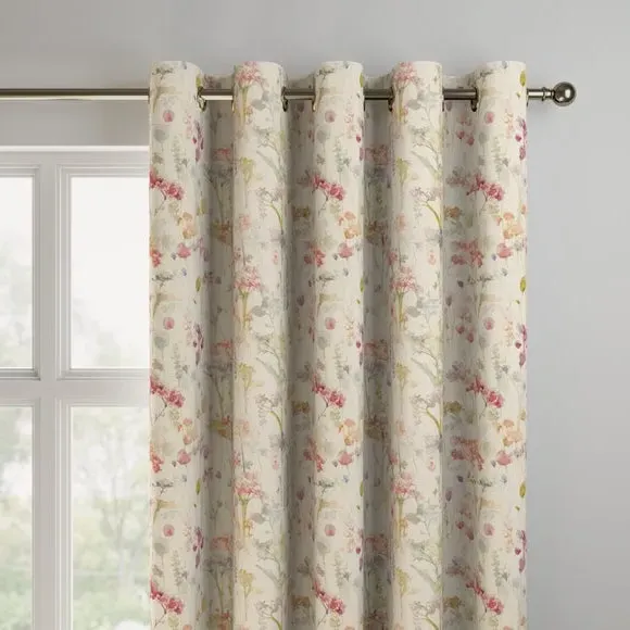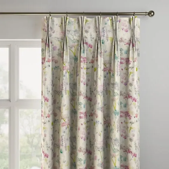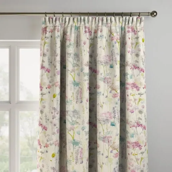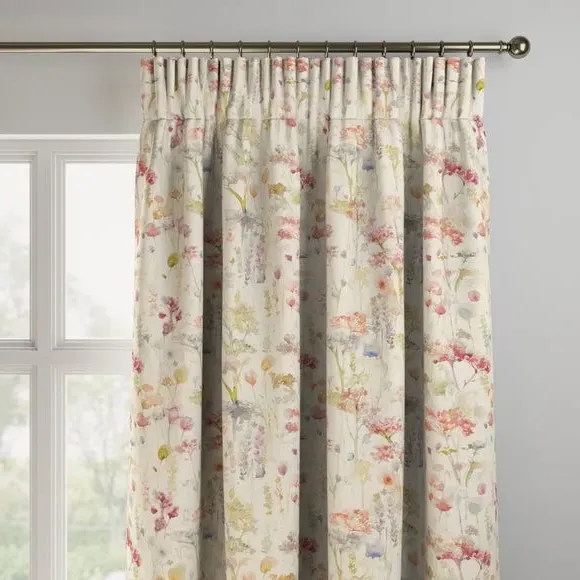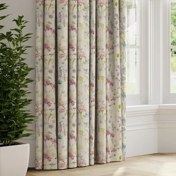 The Made to Measure Curtains feature watercolour floral print on a soft cotton and linen blend. Multiple header options include eyelet and pinch pleat styles, while lining choices range from blackout to thermal for enhanced functionality. The custom sizing accommodates various window dimensions, with fabric joins added for widths over 124cm to maintain full coverage.