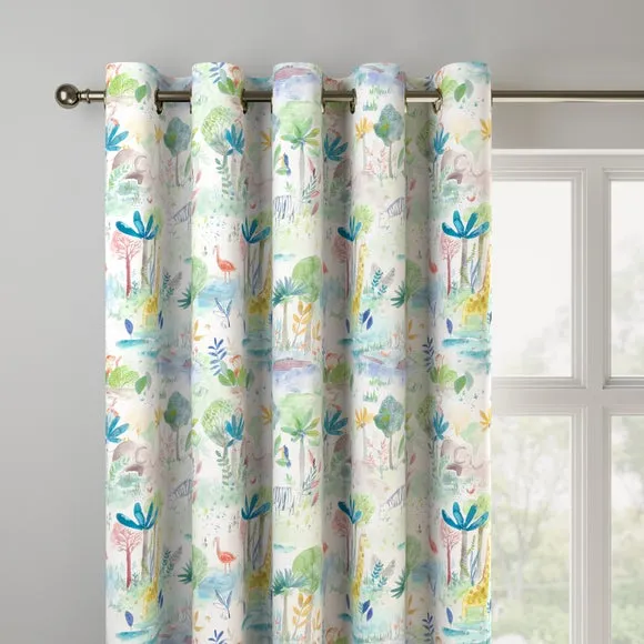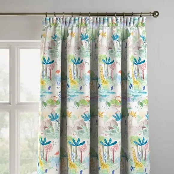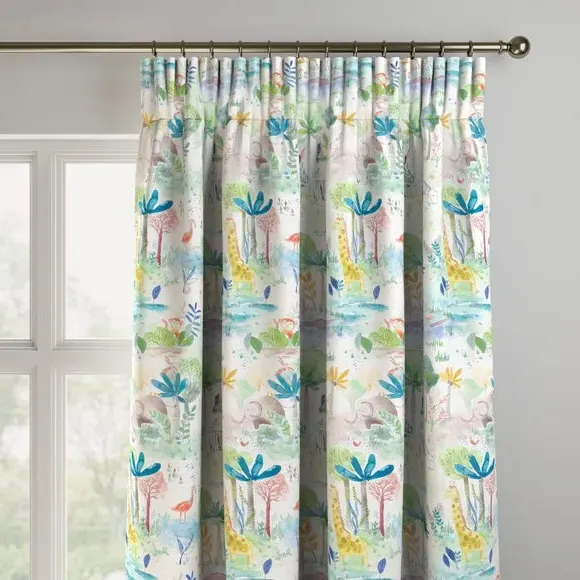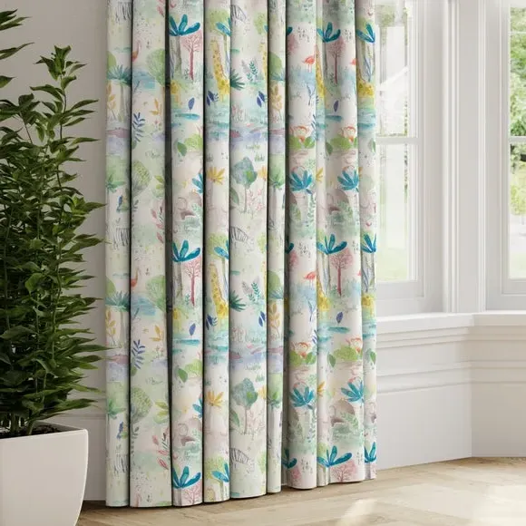Inspire your little ones and take them on an adventure. This 100% cotton curtain features a wonderfully playful scene of zoo inspired designs feature giraffes, zebras, and monkeys in a gorgeous watercolour effect, sure to add a joyful flair to any home. Our Web Exclusive Little Adventurers range features 5 playful, unique designs for curtains, upon a 100% cotton fabric base, and includes a wide range of styles. Introducing imagination and creativity into your décor, with designs like Zoo, Unicorn, Jurassic and Hot Air Balloon, will inspire younger minds, and create unique, playful spaces in any room. 100% natural fibres like cotton are kinder to the environment, as well as to our skin, being naturally hypoallergenic, meaning they are ideal for sensitive and allergy-prone skin, as well as having unique anti-bacterial qualities. You can feel confident that our Little Adventurers’ range will be gentle to the environment and inspire the minds of those who find stories within their designs. Please note: you measure for pinch pleat curtains in the same way as pencil pleat curtains**Online Only:**This product is only available to order online. Our expert virtual consultants can provide advice on measuring/fitting and style tips and our free samples can be ordered online to be delivered straight to your home to help you choose a fabric that's right for you. Once you're happy, simply place your order online and we'll do the rest. Please note: If your measured width is over 124cm your curtains will come with a fabric join to provide the full width required.
