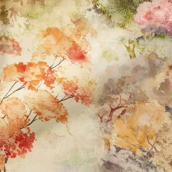 The Roman blind features watercoloured tree patterns with customizable lining options including blackout, thermal, and standard. Its made-to-measure design provides precise fitting with choice of inside or outside recess mounting, while the operating chain can be positioned on either side for convenient access. The blind includes safety clips that attach cords to fabric and detach under pressure to prevent strangulation risks. Widths over 130cm may include fabric joins to achieve full coverage.