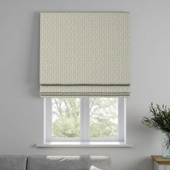 The Roman blind features a geometric leaf print crafted from a cotton and linen blend. Its customizable design offers three lining options including blackout, thermal, or standard to suit different light control needs. The operating chain can be positioned on either side, while the blind accommodates both inside and outside recess installation. The flexible mounting system provides versatile placement options for various window configurations.