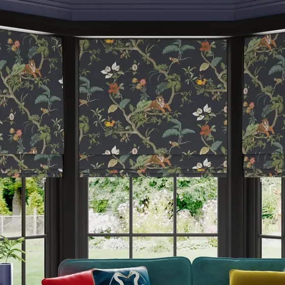 The Roman blind features a digitally printed jungle-inspired design with a hand-drawn tiger motif on sophisticated olive velvet fabric. Its made-to-measure construction provides a precise fit, while the cord mechanism with safety clips ensures smooth operation and child protection. The blind offers multiple lining options including blackout for minimal light disturbance and thermal for temperature control. Safety clips attach cords to fabric and detach under pressure to prevent strangulation risks.