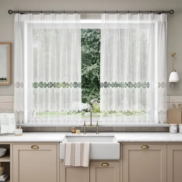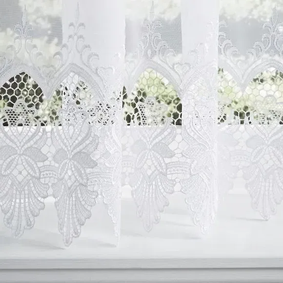 The voile curtains feature sheer polyester fabric with an intricate macramé base design that creates subtle texture and pattern. The lightweight material filters natural light beautifully while offering privacy, and the soft drape adds graceful movement. Available header options provide flexibility for various curtain pole and track systems.