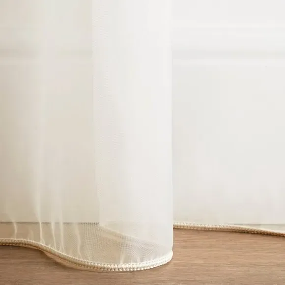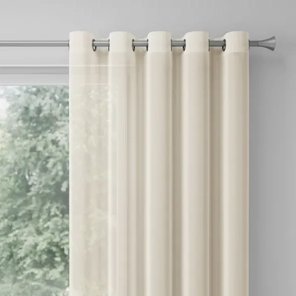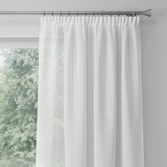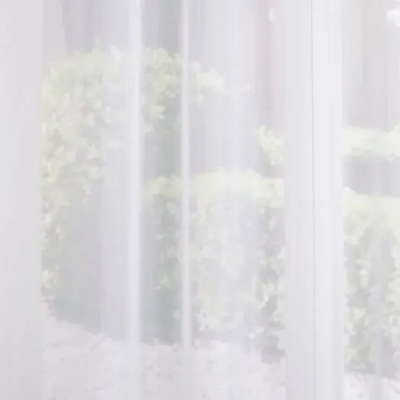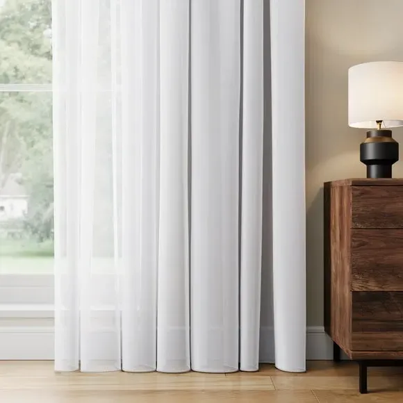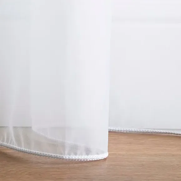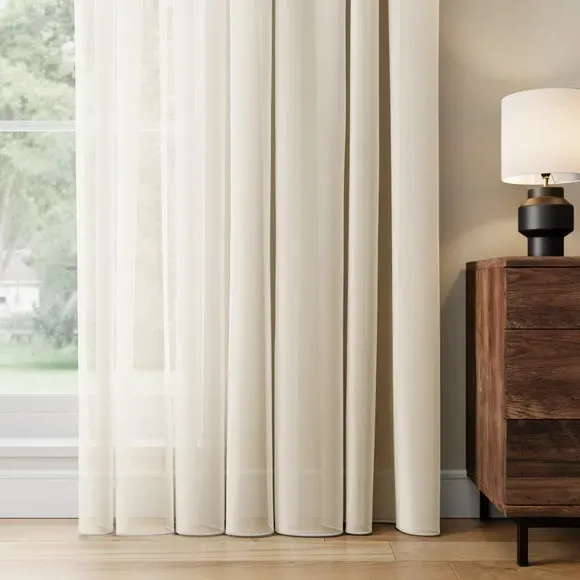 The voile curtains offer fire retardant protection with BS5867 compliance, featuring lightweight polyester construction. The plain design provides gentle light filtering while maintaining privacy, with multiple header options available. The fire retardant fabric and lining ensure safety across various environments, while the soft texture adds comfort to window treatments.