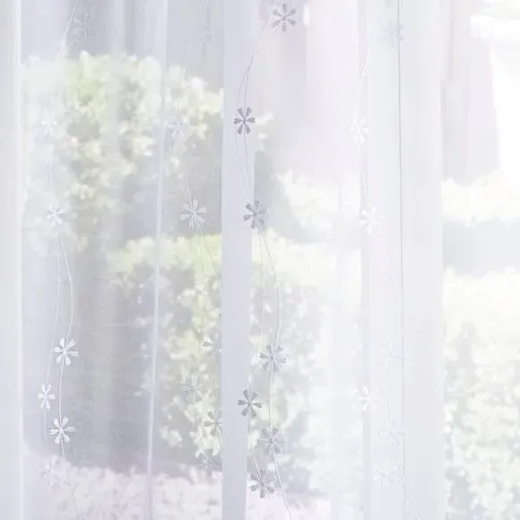 The voile curtains feature lightweight, airy fabric with soft embroidered daisy patterns that provide privacy while maintaining natural light flow. The custom-made design offers multiple header options to suit different window styles, while the delicate embroidery adds textural interest. The semi-sheer voile construction filters light gently, and the made-to-measure service ensures a precise fit for any window.