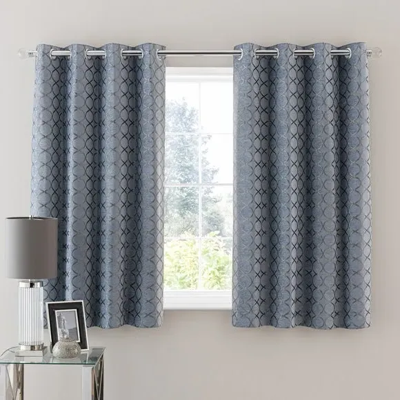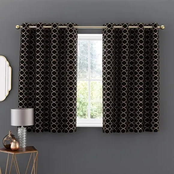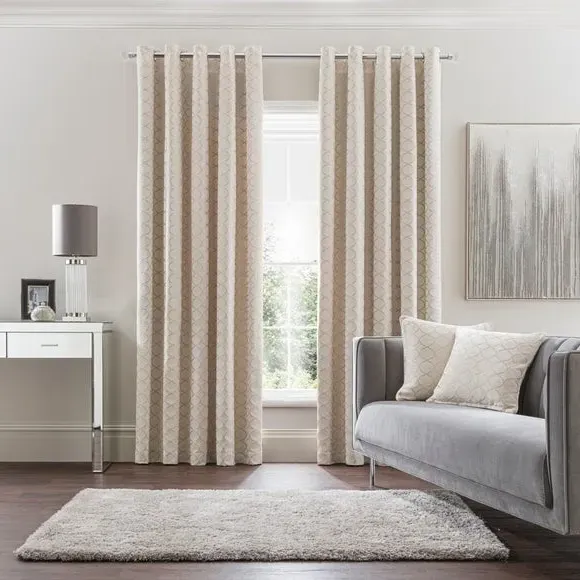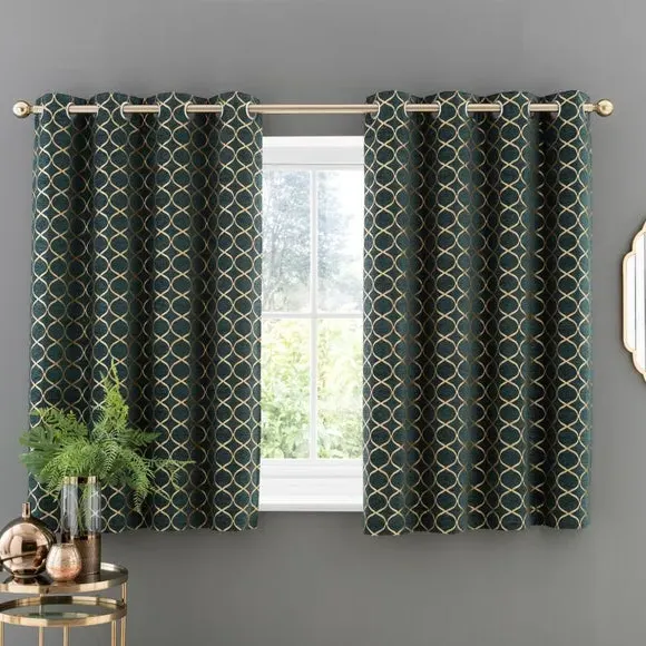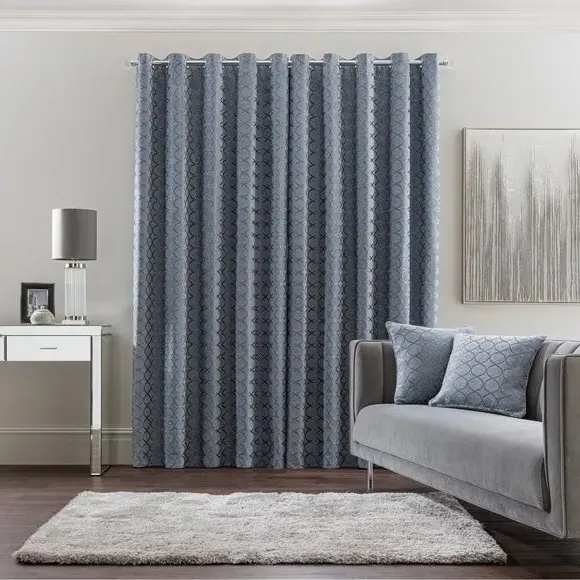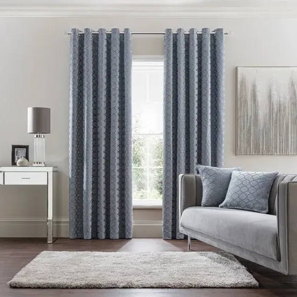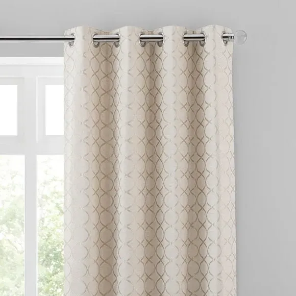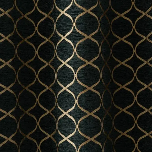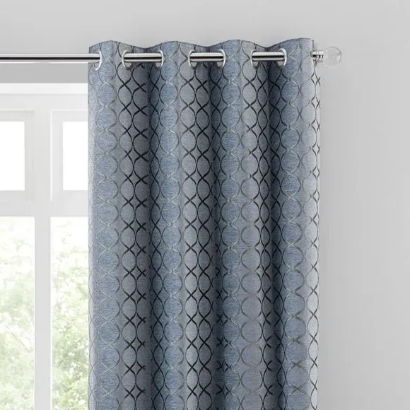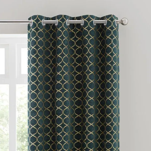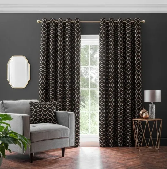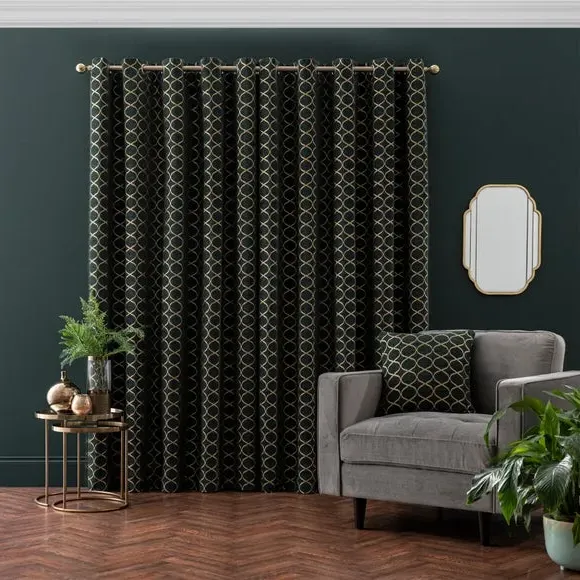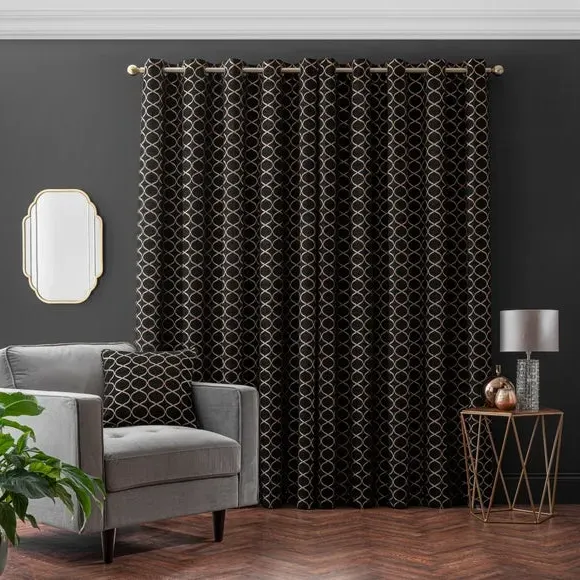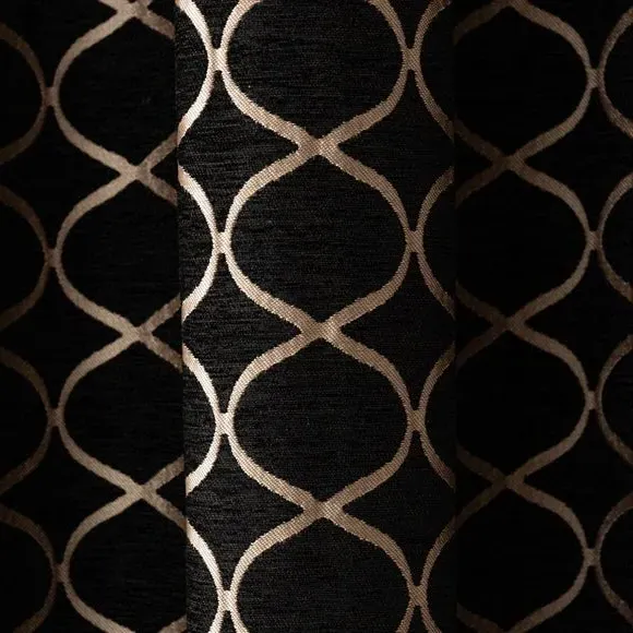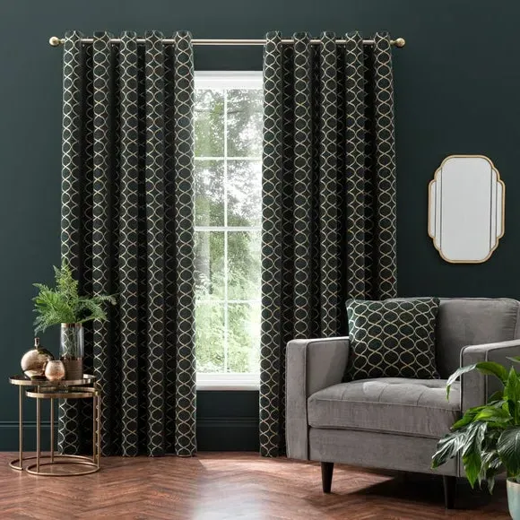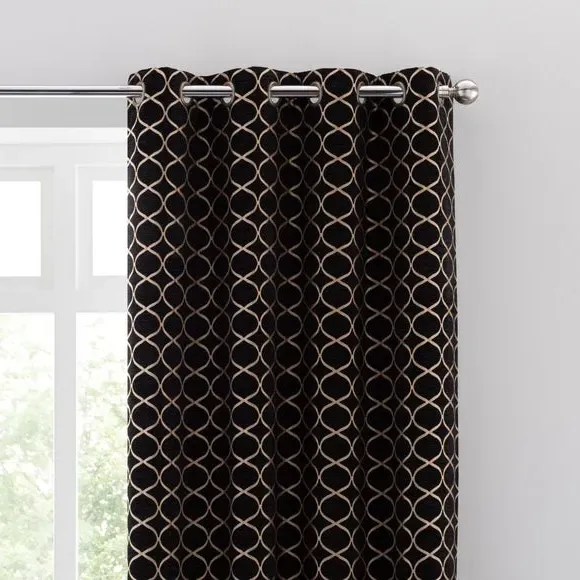 * 1 pair - includes 2x curtain panels* Fully lined* Eyelet header* Ogee design* Available in choice of sizes Crafted from a stunning jacquard chenille fabric for a beautifully soft texture, these stylish black curtains are decorated with a stunning ogee pattern and are perfect for bringing a luxurious finish to any room. These curtains are fully lined to improve insulation while increasing privacy and are designed with a modern eyelet header for easy hanging and a gorgeous drape. Available in a selection of widths and drops, these curtains are ideal for lending an opulent edge to your décor. A coordinating cushion is available to purchase separately. The size of the curtains shown is the size of 1 panel, you will receive 2 panels of this size. Choose the width that is closest to your pole length for full look. Professional cleaning in Hydrocarbon or equivalent recommended.