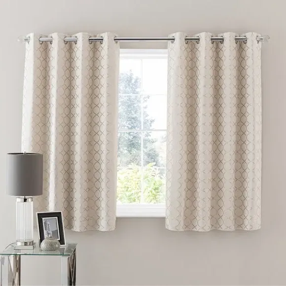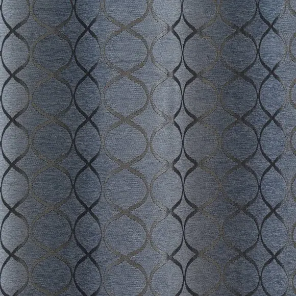 The curtains feature jacquard chenille fabric with an ogee pattern, offering a soft texture and decorative appeal. The full lining provides insulation and privacy, while the eyelet header allows for easy hanging and smooth draping. Each pair includes two panels designed to work together for complete coverage.
