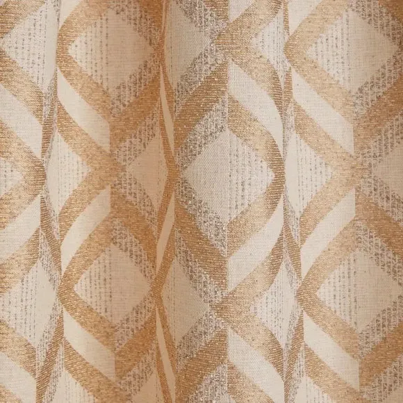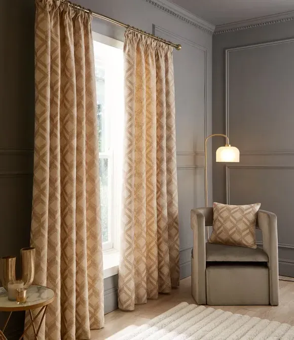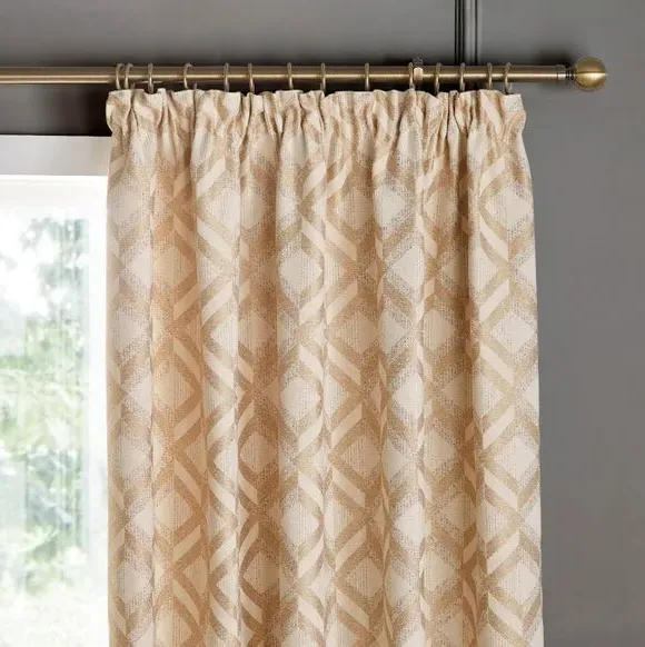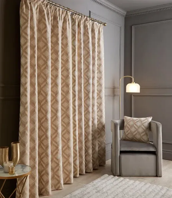 The curtains feature a geometric jacquard print with pencil pleat headers that create neat, uniform folds. The set includes two panels with traditional tailored construction, while the jacquard weaving adds texture and visual interest. Multiple width and drop options accommodate various window sizes, and the natural tone complements diverse interior styles.