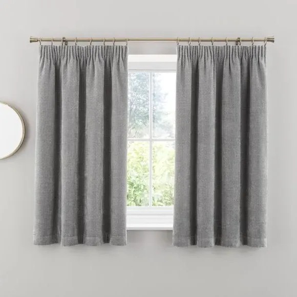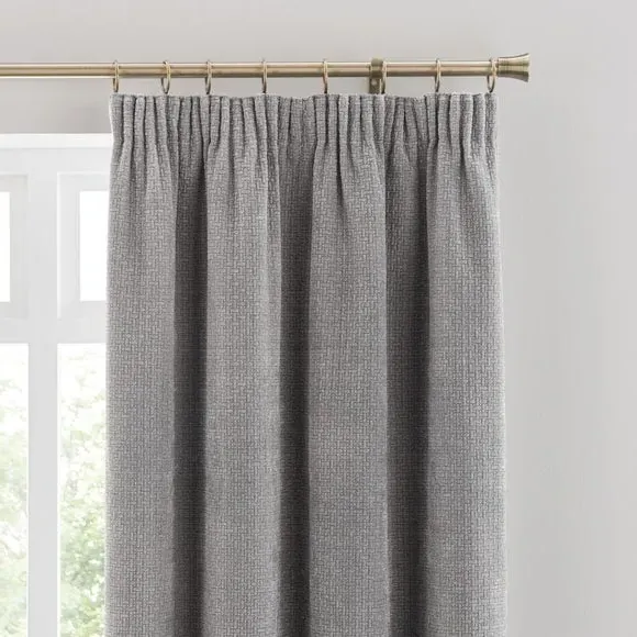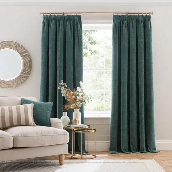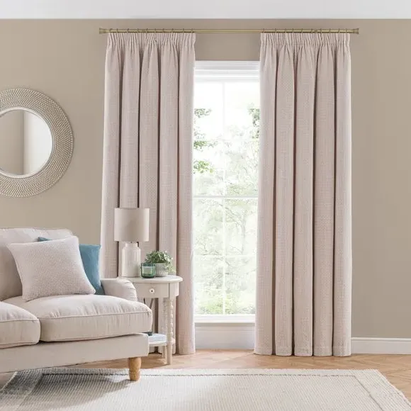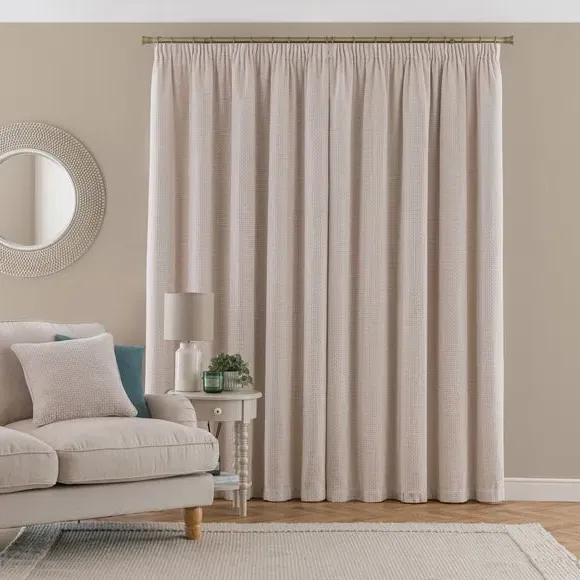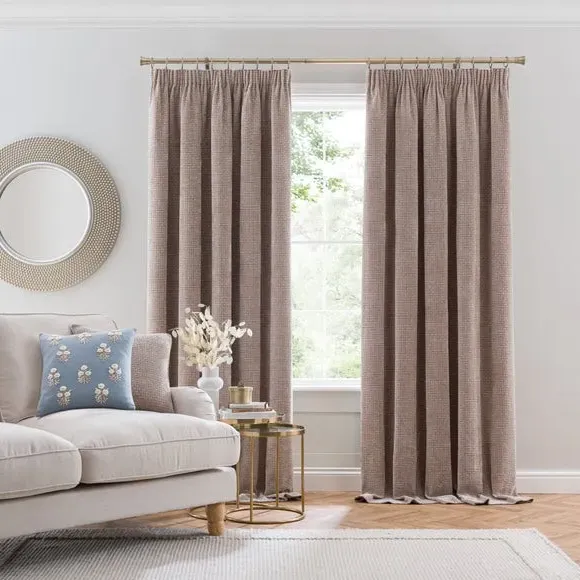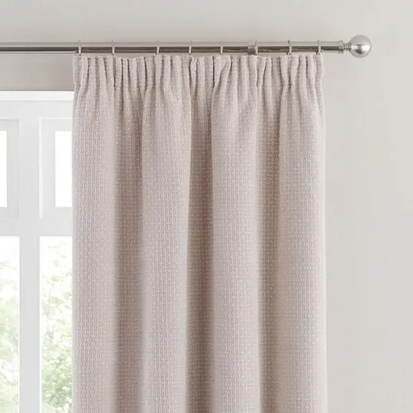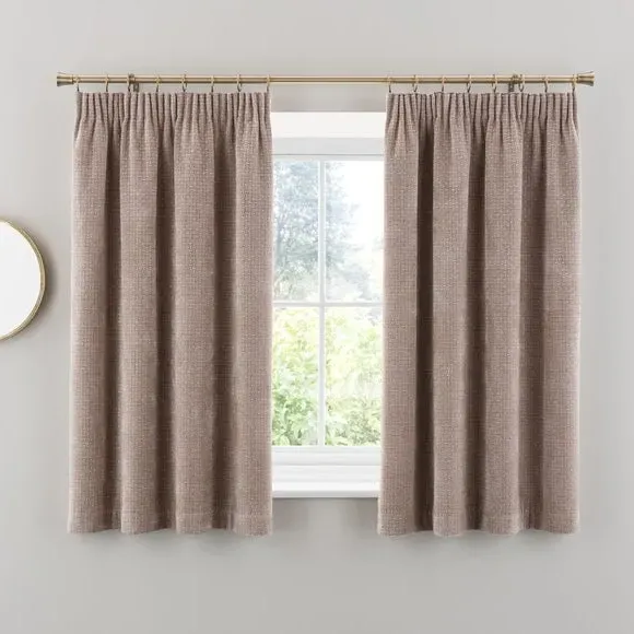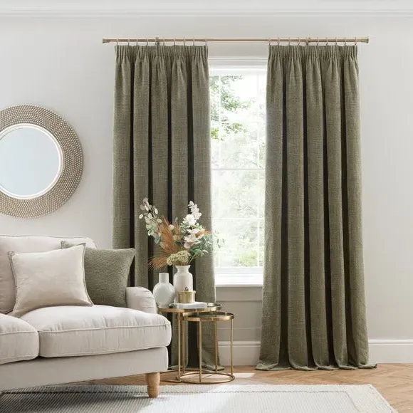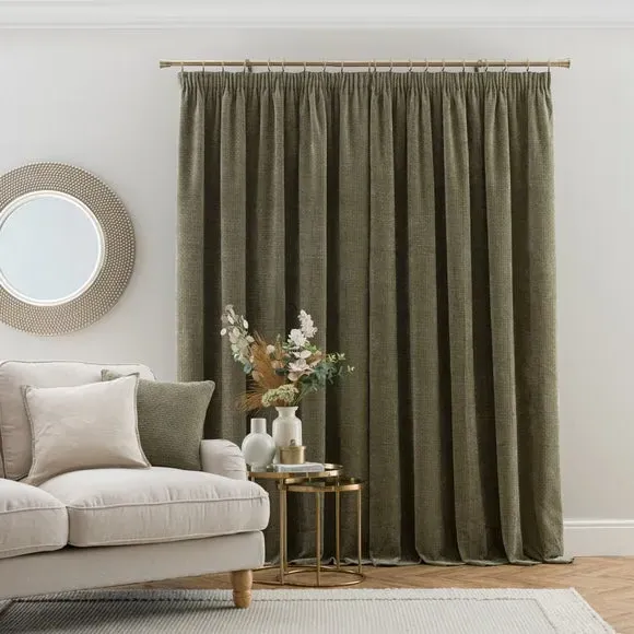 The curtains combine soft chenille texture with a classic basketweave design for added visual interest. Featuring a traditional pencil pleat header, they offer easy hanging while the full lining provides enhanced privacy and light control. Made from 100% recycled polyester, the fabric delivers durability with sustainable construction. Sold as a pair, these fully lined curtains include coordinating cushion options for a complete look.