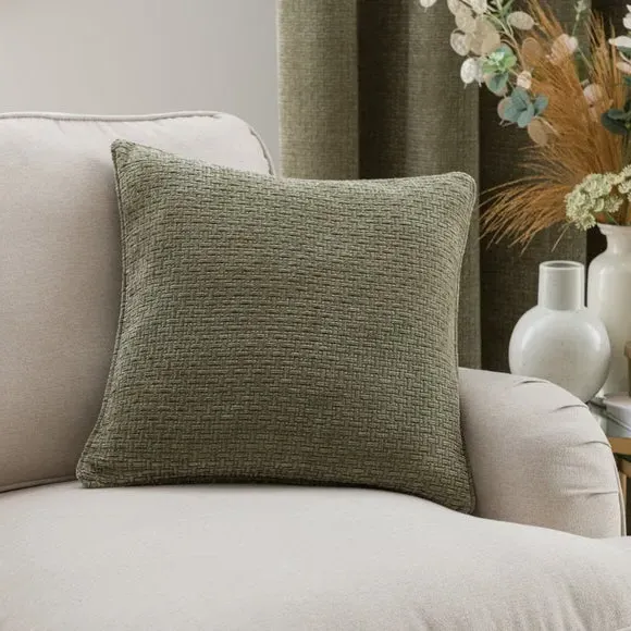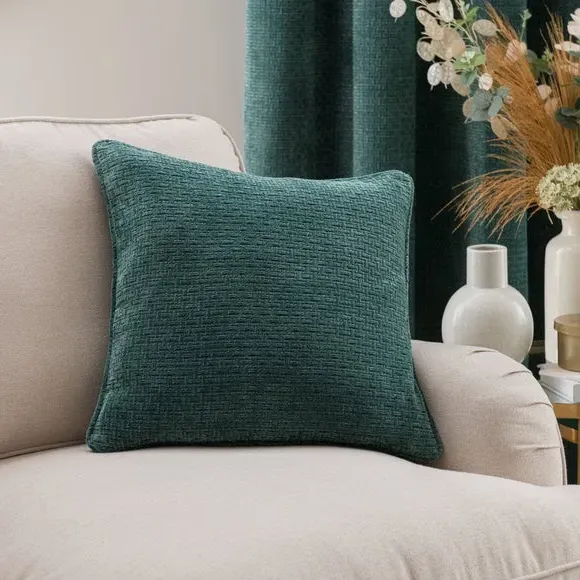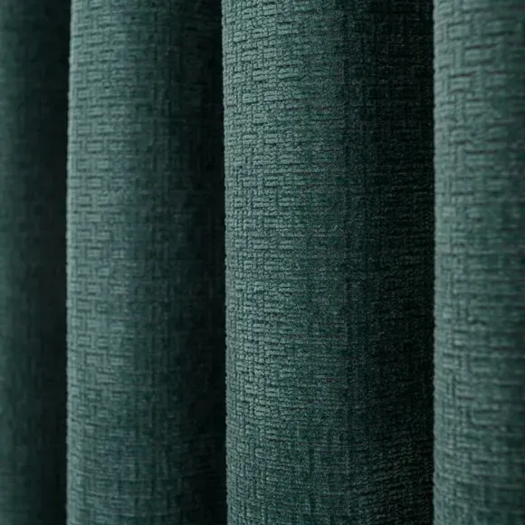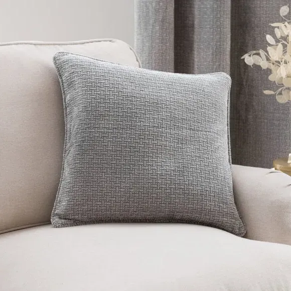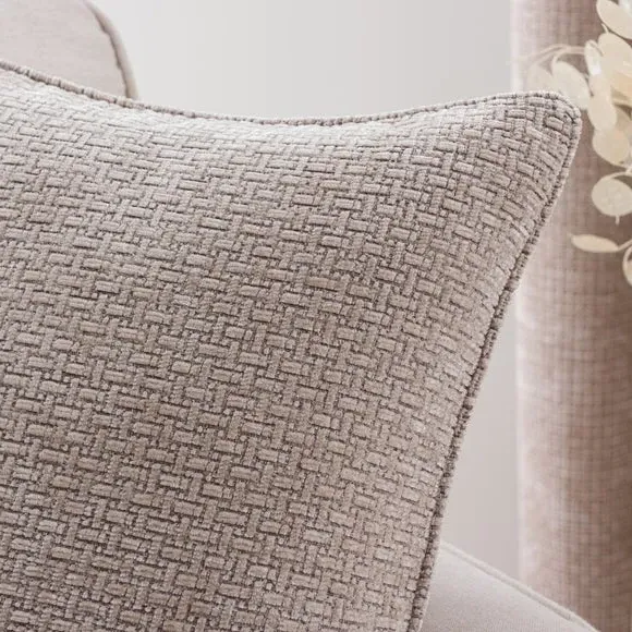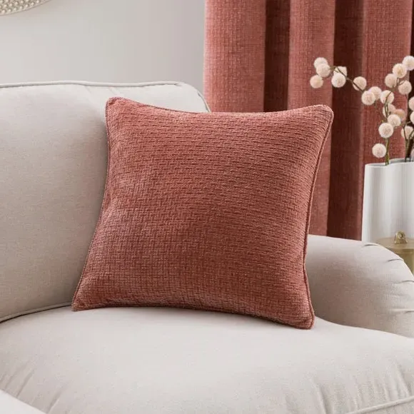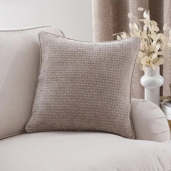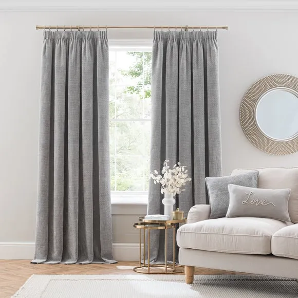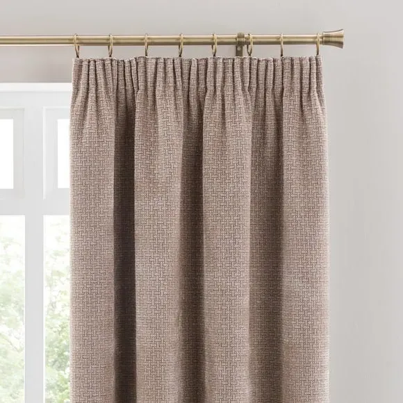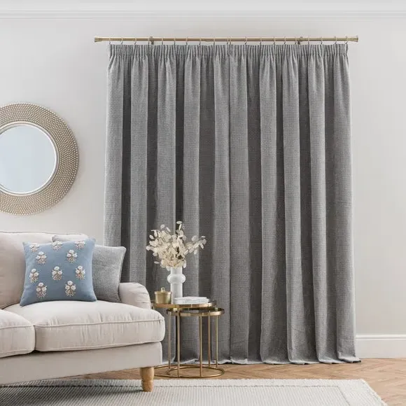 The curtains combine soft chenille texture with a classic basketweave design for added visual interest. Featuring a traditional pencil pleat header, they offer easy hanging while the full lining provides enhanced privacy and light control. Made from 100% recycled polyester, the fabric delivers durability with sustainable construction. Sold as a pair, these fully lined curtains include coordinating cushion options for a complete look.