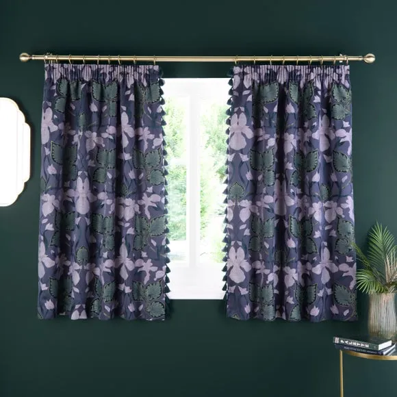 The curtains feature a contemporary floral design with eye-catching contrast trim, crafted from 100% polyester fabric. The pencil pleat header provides easy hanging and creates elegant gathered folds when drawn. Each pair includes two panels with modern styling that combines durability with visual appeal.