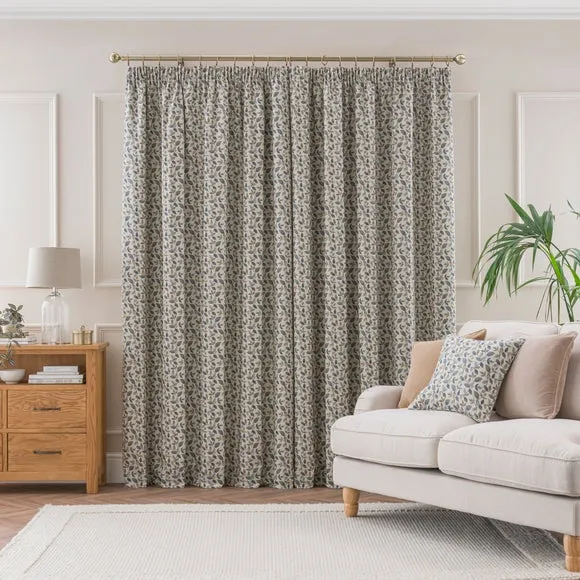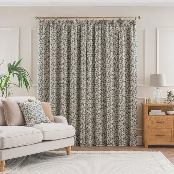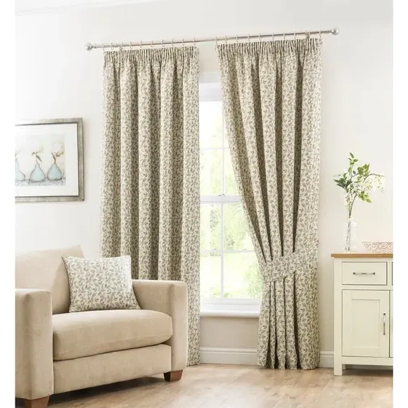 The curtains feature a classic pencil pleat header that creates a gathered, tailored appearance. Each pair includes two panels with full lining for enhanced insulation and light control. The tapestry floral jacquard print adds texture and visual interest, while the lined construction provides durability and improved drape.