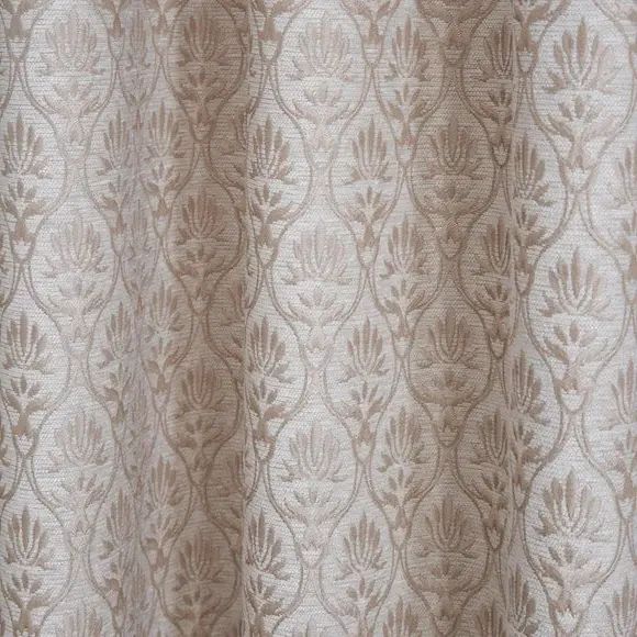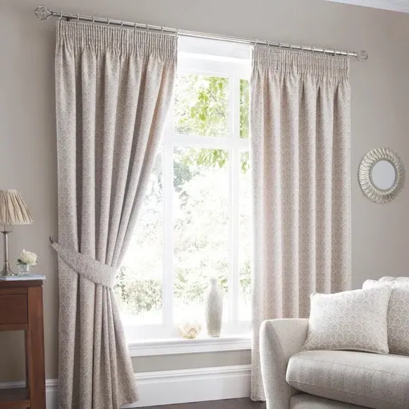 The curtains feature a textured woven motif with classic pencil pleat headers for easy hanging. Each pair includes two lined panels that provide enhanced privacy and light control. The cream fabric combines durability with style, while the traditional pleating creates elegant folds when drawn.