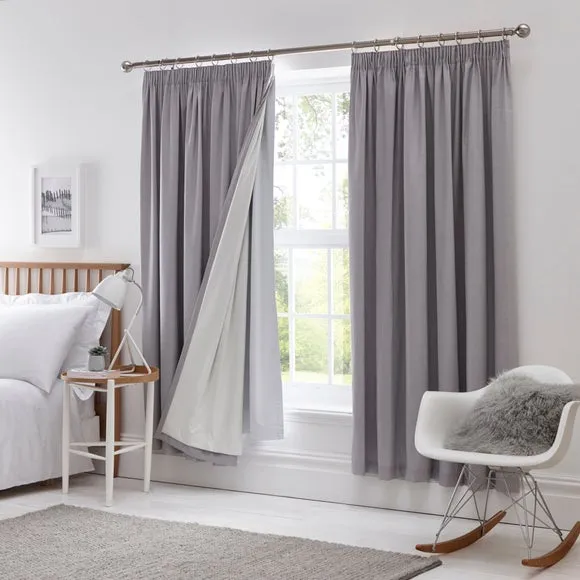 The thermal curtain linings provide year-round temperature regulation with their insulating properties that keep rooms warm in winter and cool in summer. The thick lining reduces draughts and dampens external noise, while the pencil pleat design allows easy attachment to existing curtains. These versatile linings can be cut to size and help reduce heating costs by improving energy efficiency. The set includes 2 panels designed to hang discreetly behind main curtains.