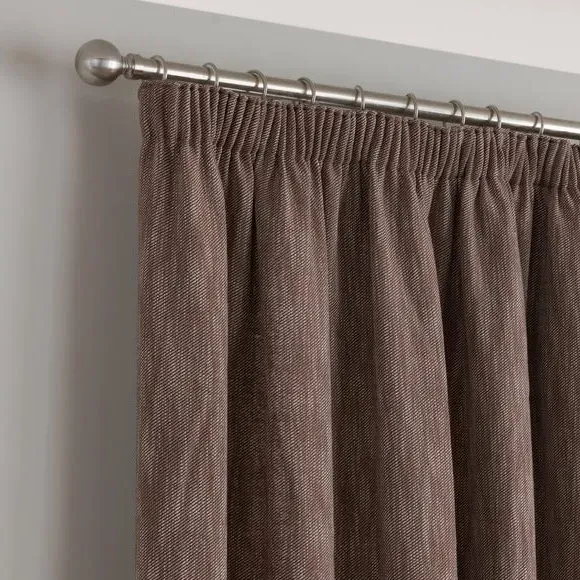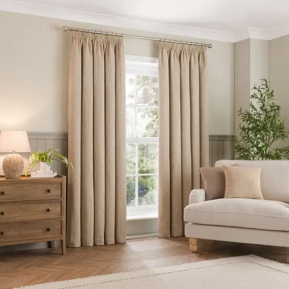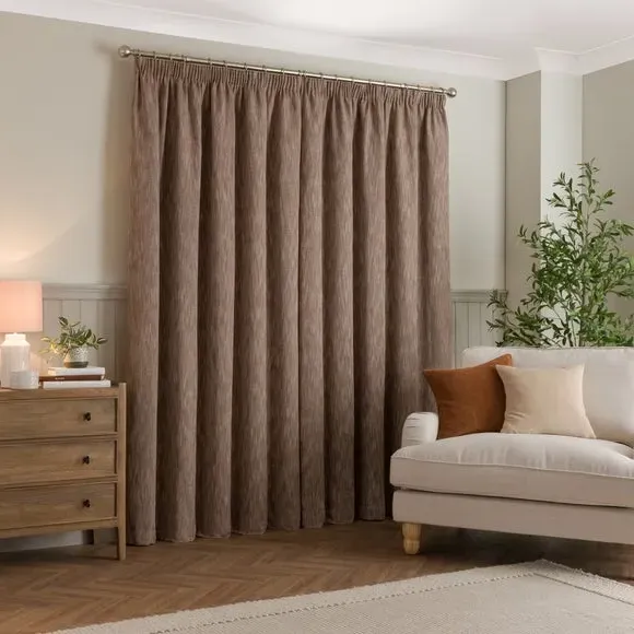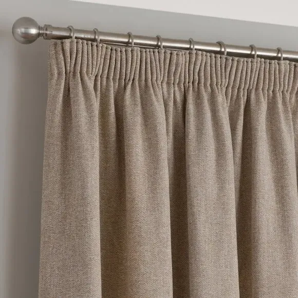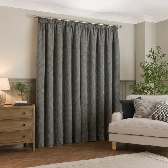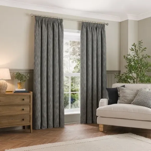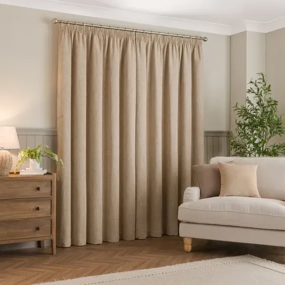 The curtains offer temperature regulation with their thermal lining, featuring a traditional pencil pleat header for classic appeal. The textured twill fabric provides durability and style, while the insulating properties help maintain comfortable room temperatures. Each set includes two panels with gathered pleating that creates elegant folds when hung.