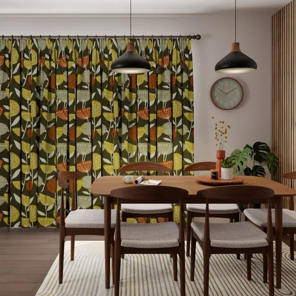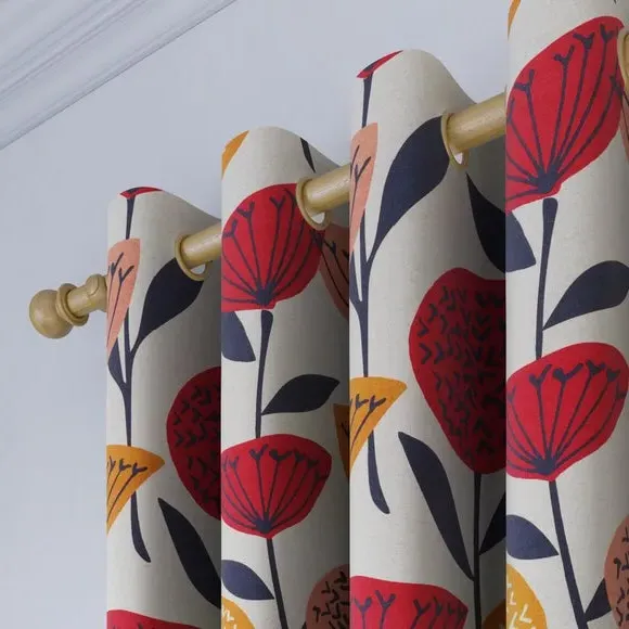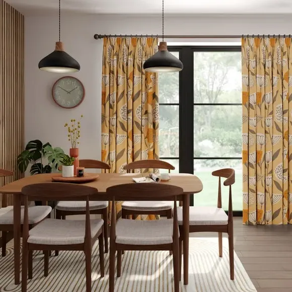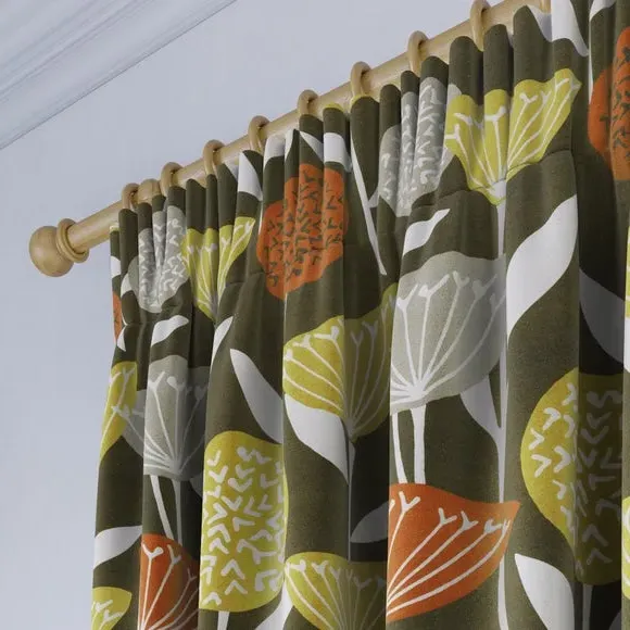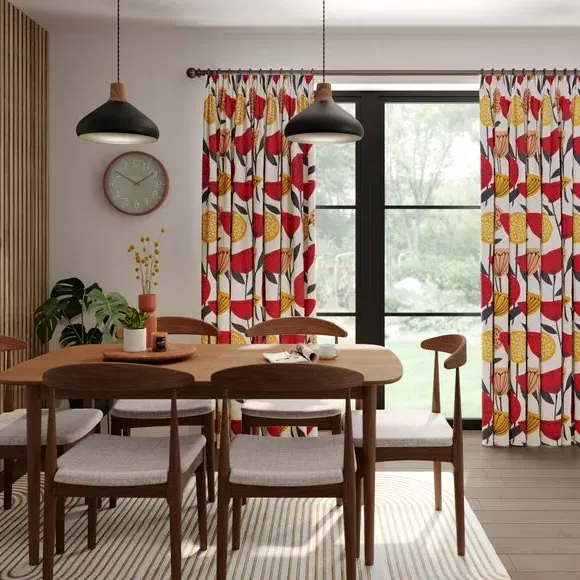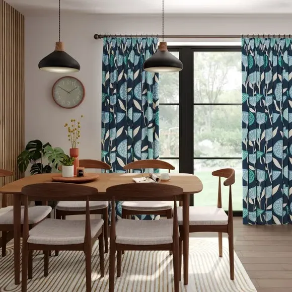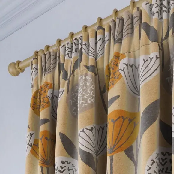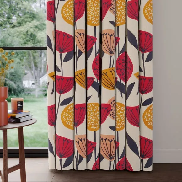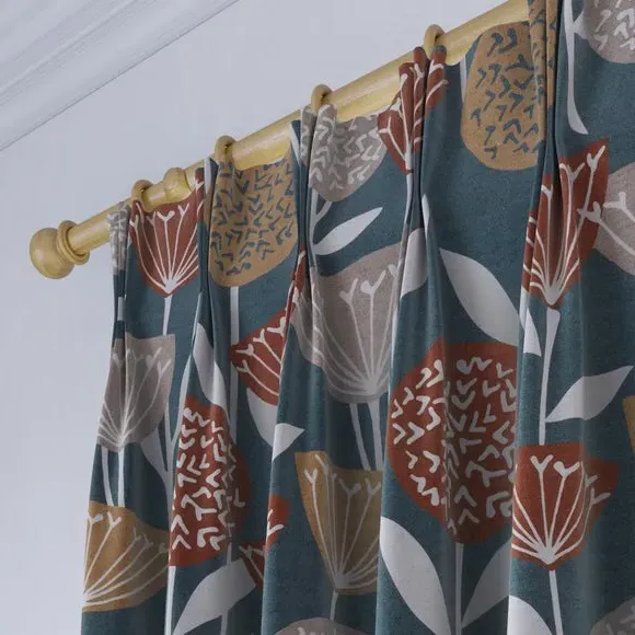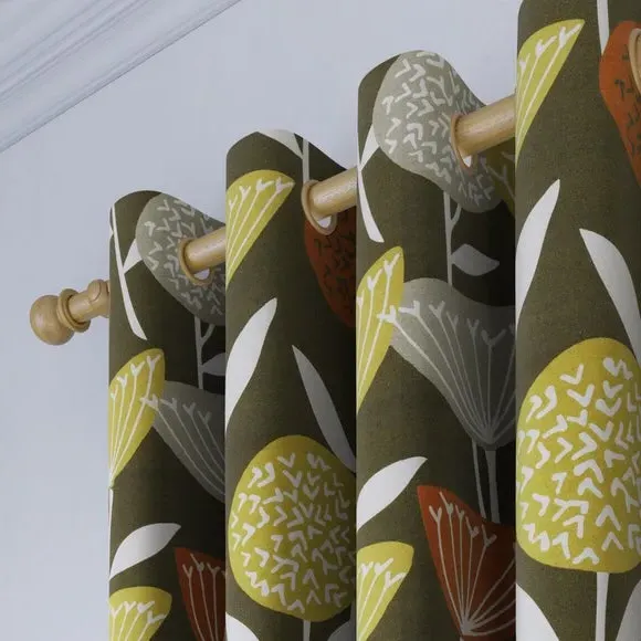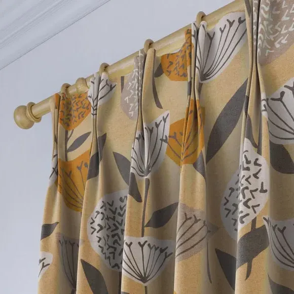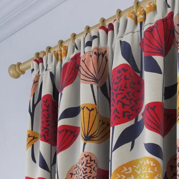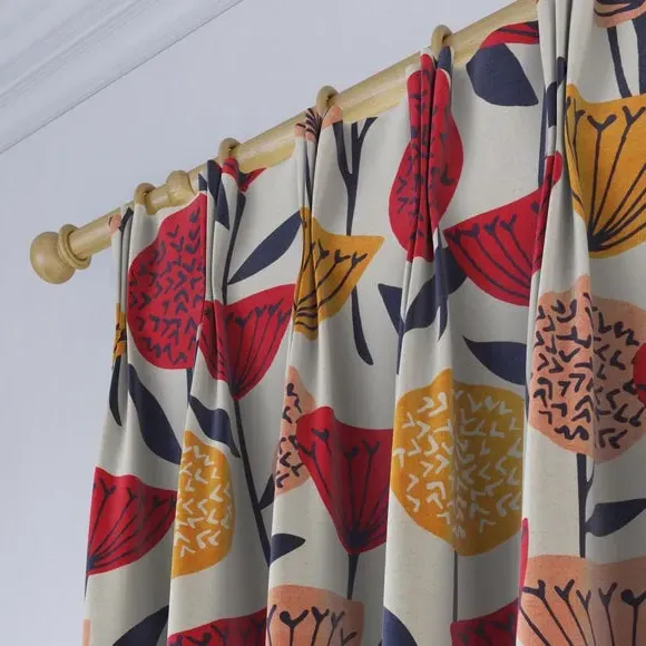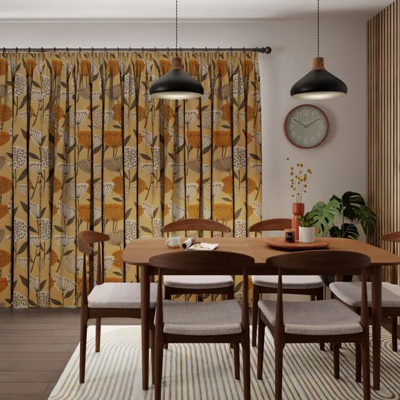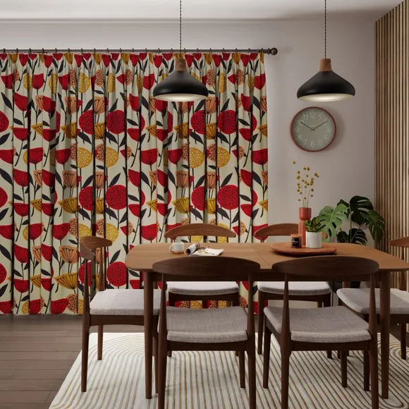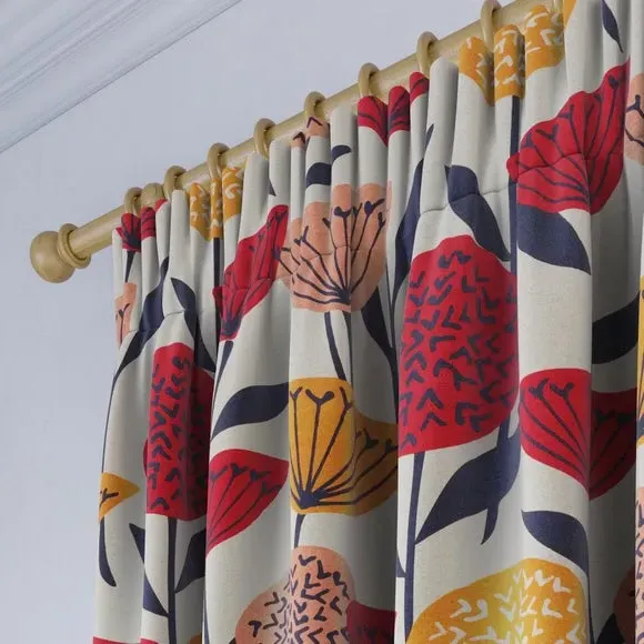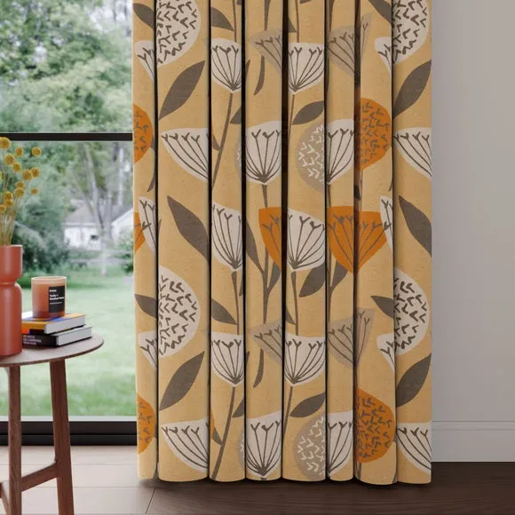 The curtains feature a striking dandelion-printed floral pattern balanced by geometric structure, creating a Scandinavian-inspired design. Crafted from a premium cotton and linen blend, they combine cotton's softness and breathability with linen's durability and textured charm. The natural composition provides an organic, tactile feel, while multiple header and lining options ensure a customised fit. Available with coordinating accessories for a cohesive look.