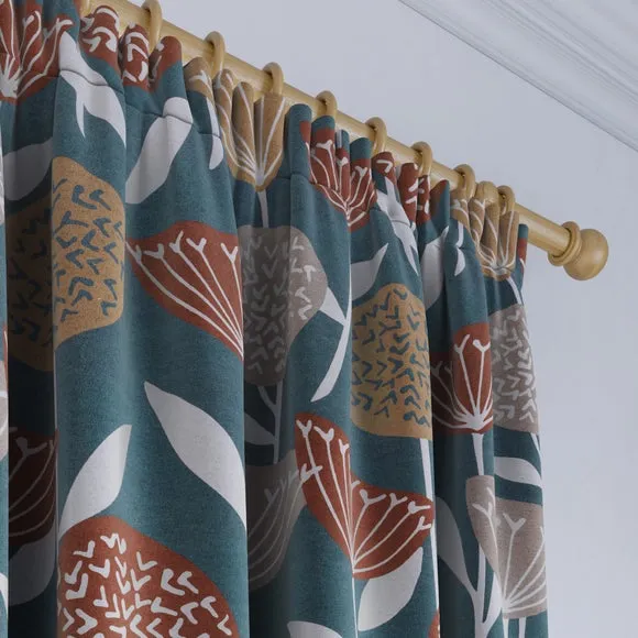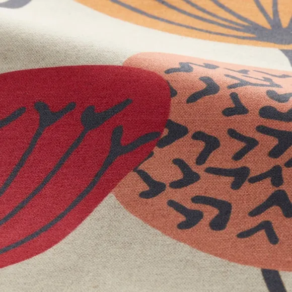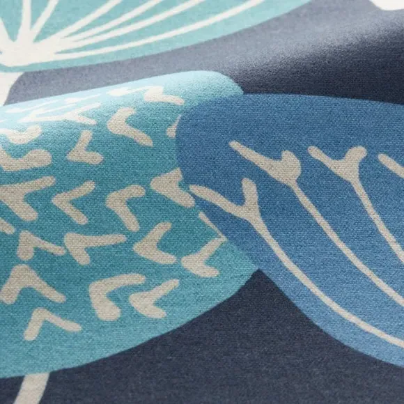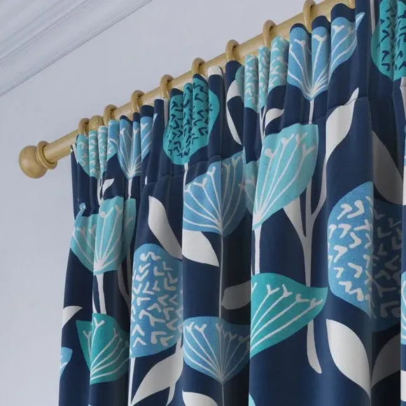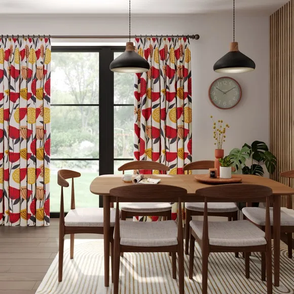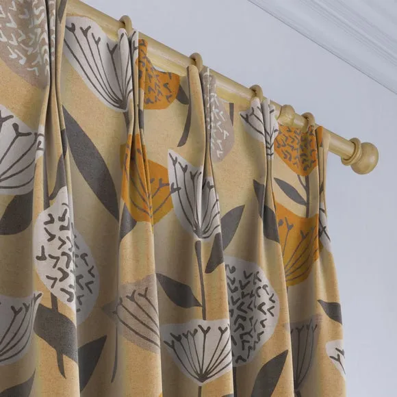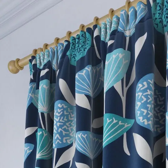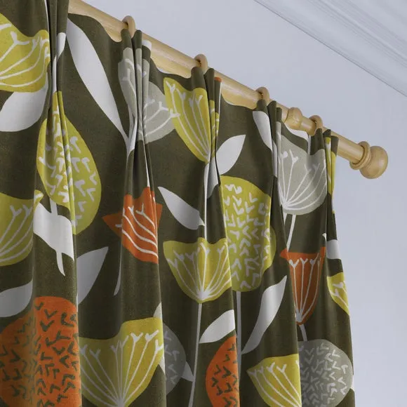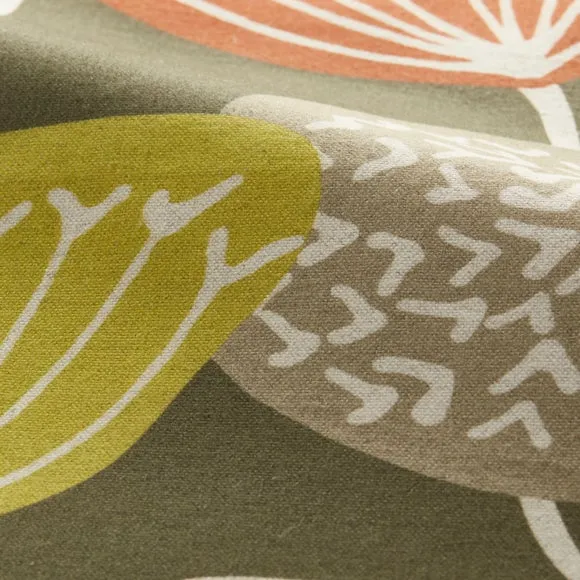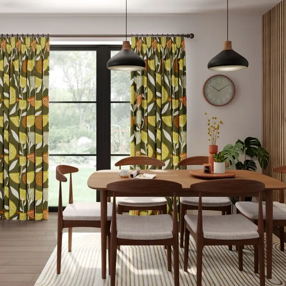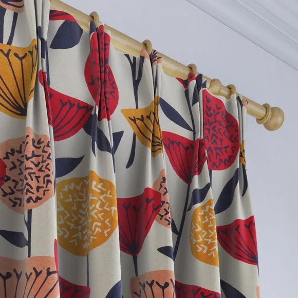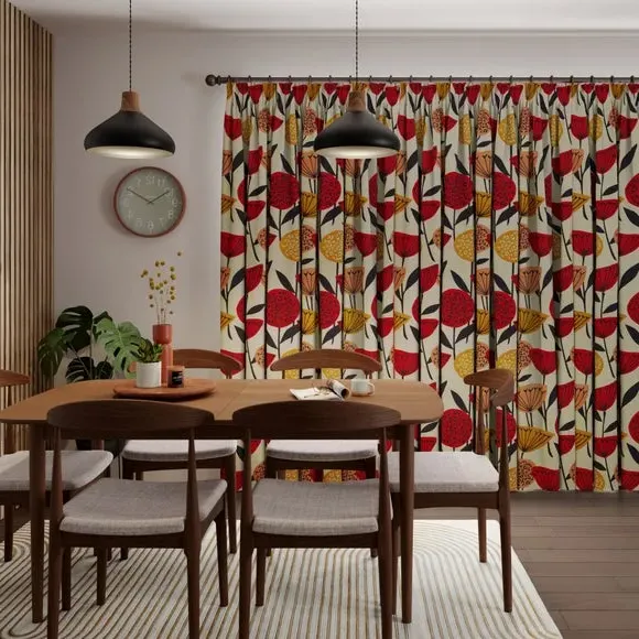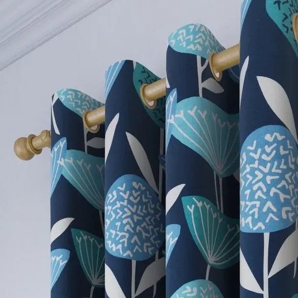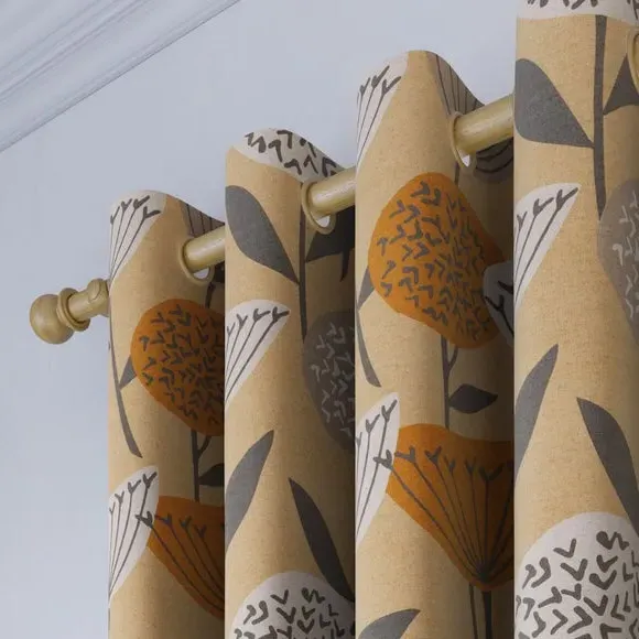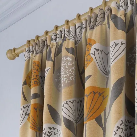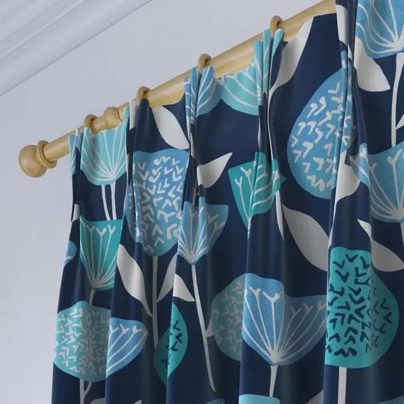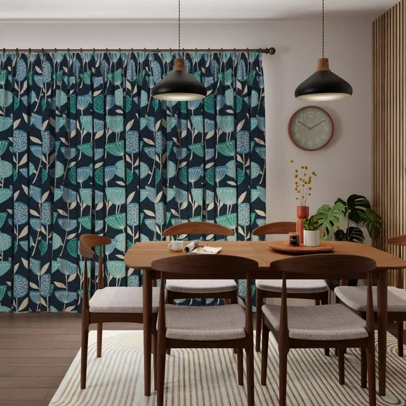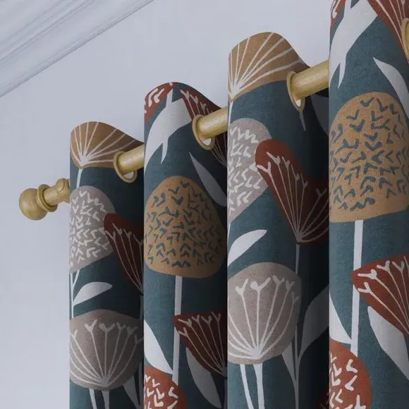 The curtains feature a striking dandelion-printed floral pattern balanced by geometric structure, creating a Scandinavian-inspired design. Crafted from a premium cotton and linen blend, they combine cotton's softness and breathability with linen's durability and textured charm. The natural composition provides an organic, tactile feel, while multiple header and lining options ensure a customised fit. Available with coordinating accessories for a cohesive look.