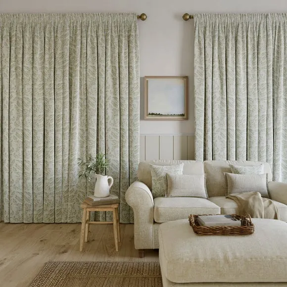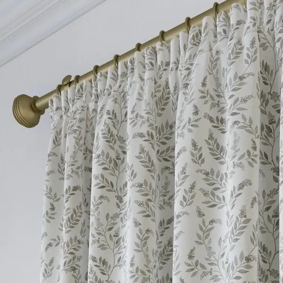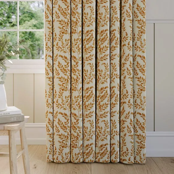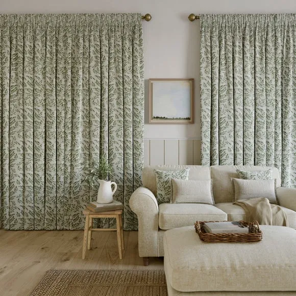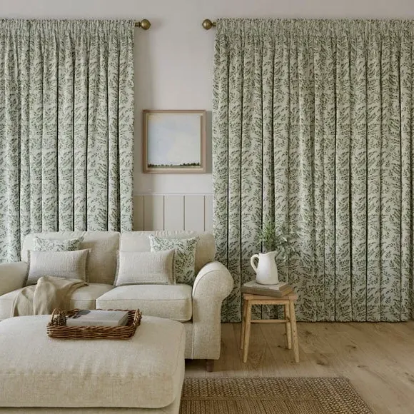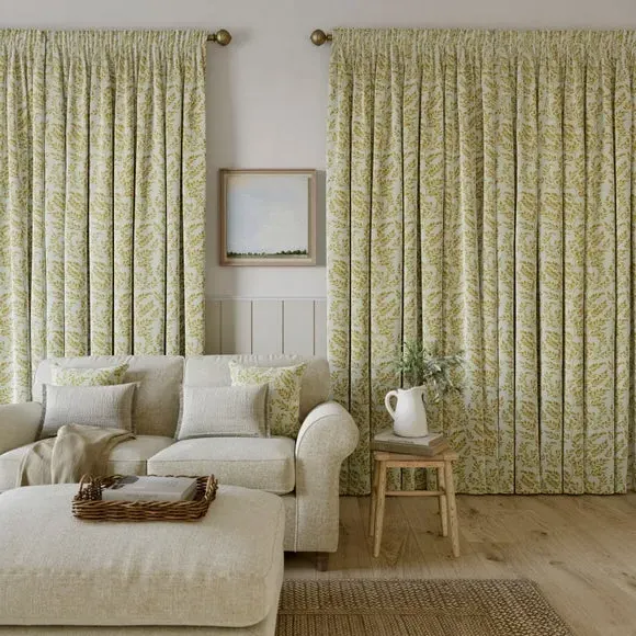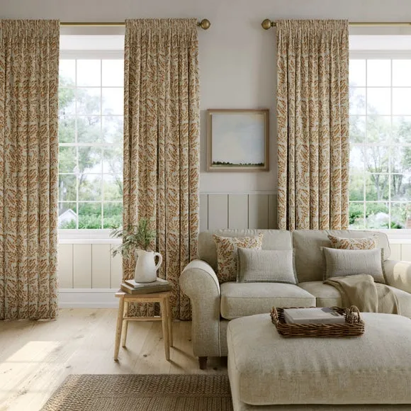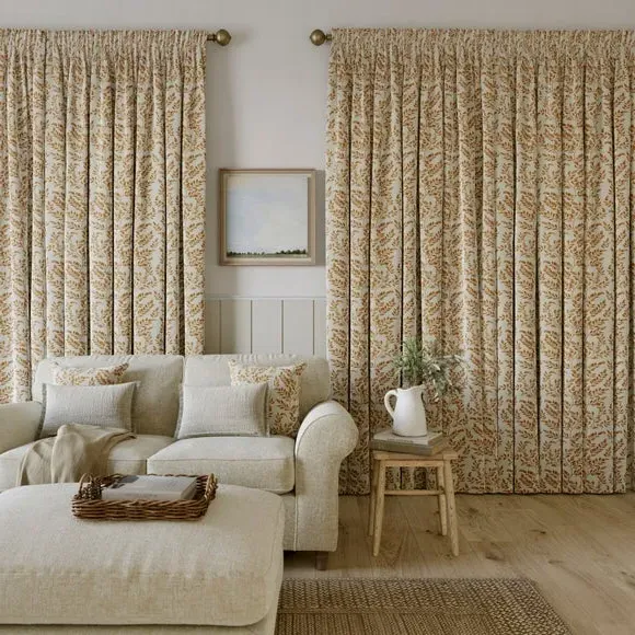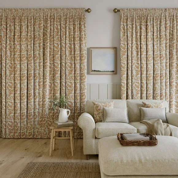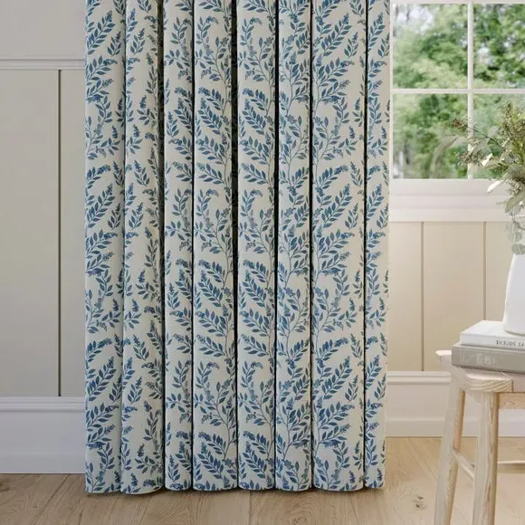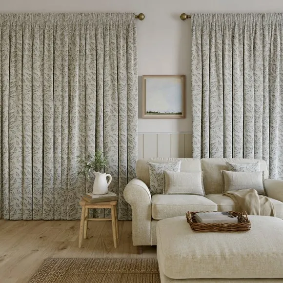 The curtains feature a robust 100% cotton composition with a linen-look finish, displaying a floral design inspired by countryside views. The heavy cotton construction ensures the fabric maintains its quality and hangs neatly without creasing, while multiple header options including pencil pleat, eyelet, and pinch pleat allow for a tailored appearance. Available with regular, blackout, or thermal linings for enhanced functionality and privacy. The durable cotton base provides breathable comfort and long-lasting performance.