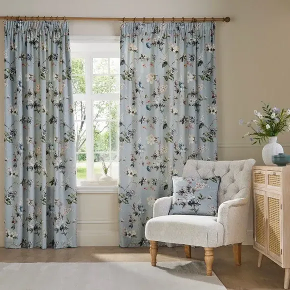 The curtains feature a hand-painted floral design in blues and greens, crafted from 280gsm recycled polyester with a velvet texture. The fully lined construction provides enhanced privacy and warmth retention, while the pencil pleat heading creates structured gathers. Each set includes two ready-made panels with digital printing that maintains vibrant color clarity.