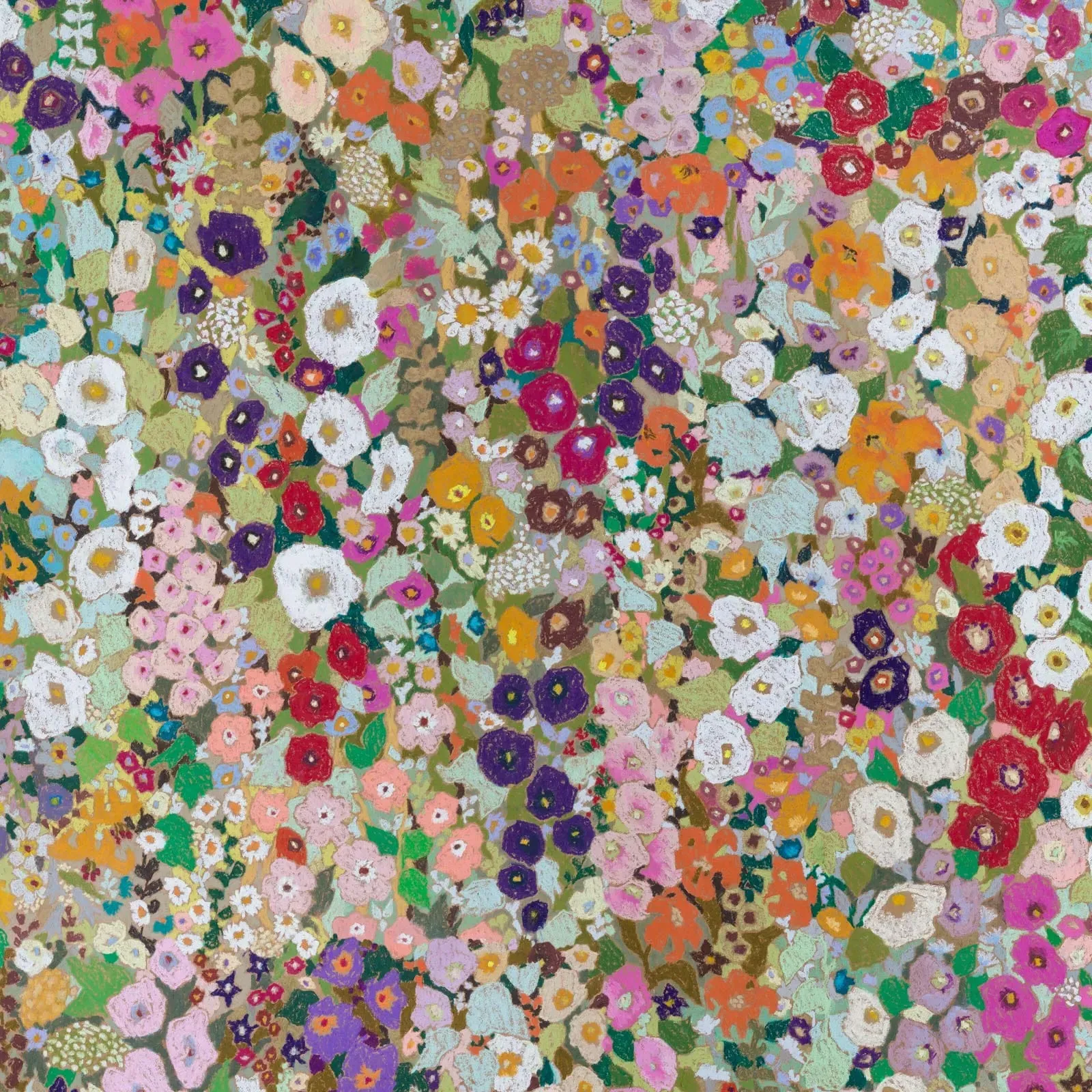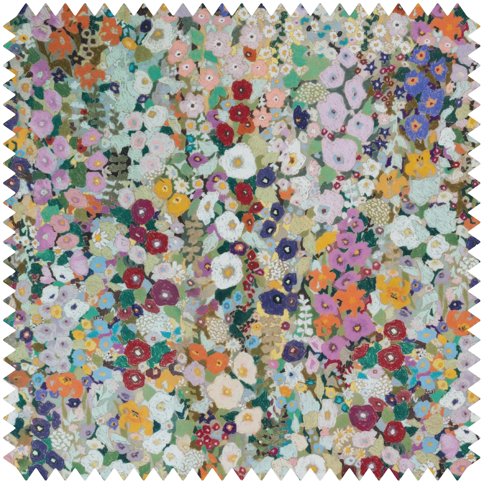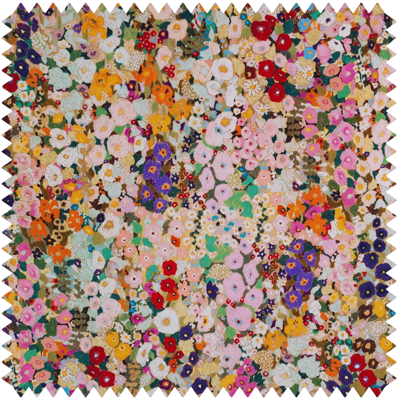 The HOLLYHOCKS fabric combines smooth cotton-linen construction with artistic floral design inspired by Gustav Klimt's garden paintings. Created by American artist Kerry Simmons, it features a riot of flowers in spring colors. Printed in Britain, this versatile fabric suits window coverings and furniture reupholstering with its pastoral charm and punk spirit.