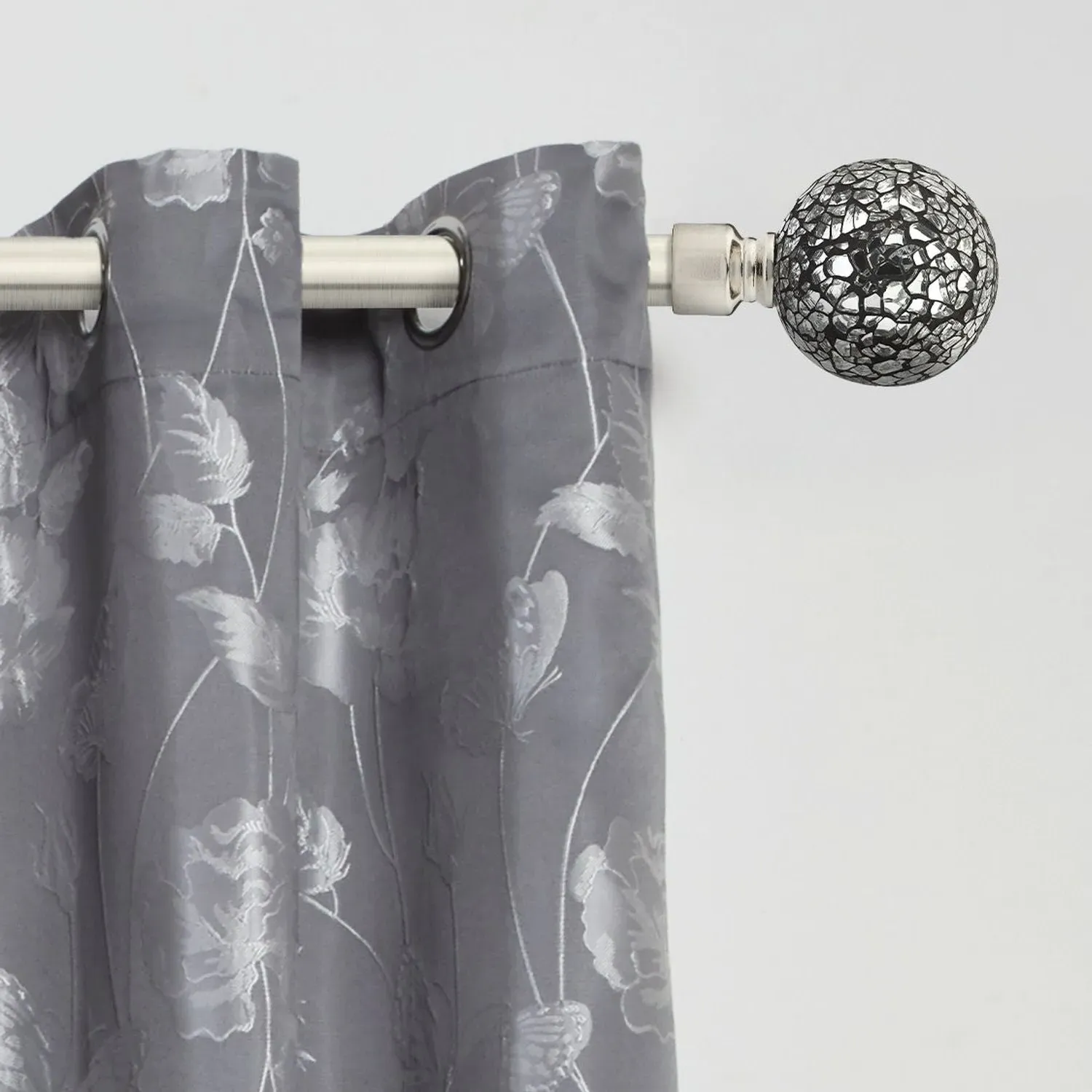 The extendable curtain pole features full stop finials with a brushed silver finish. Its telescopic design adjusts to fit various window widths, while the eyelet-compatible construction eliminates the need for additional rings. The pole mounts securely on any window type and provides smooth operation for eyelet and slot top curtains.