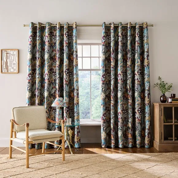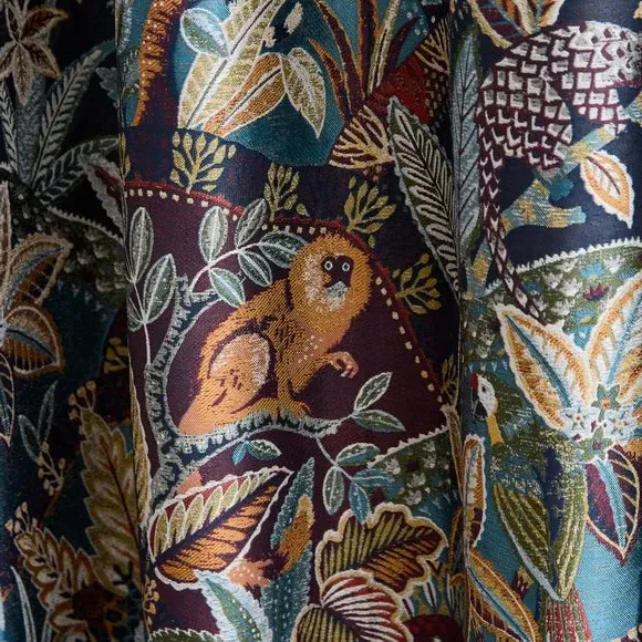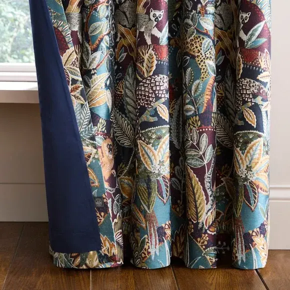 The eyelet curtains feature a vibrant botanical pattern woven in heavy jacquard fabric with full polyester lining. The eyelet header provides crisp draping and simple installation, while weighted corners ensure a beautiful hang. Its maximalist design combines rich colors with detailed natural motifs, and the durable construction adds long-lasting appeal.