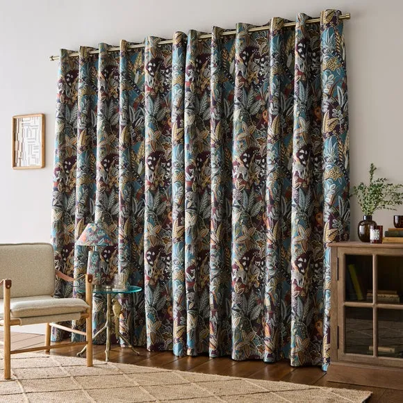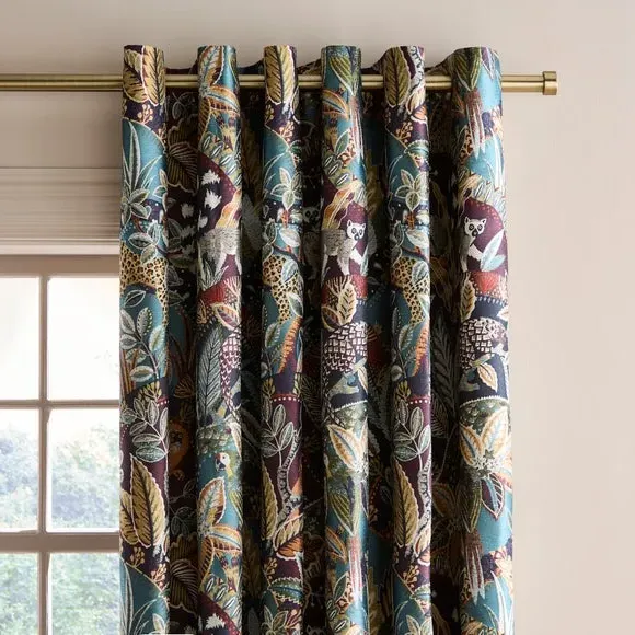 **In collaboration with the Natural History Museum**Heavy Jacquard Composition Maximalist, botanical design Weighted corners Fully Lined Eyelet Header Corresponding items available Make a maximalist statement with the Nature’s Exhibitionists Eyelet Curtains - where bold design meets conscious craftsmanship. These heavy jacquard curtains feature a vibrant botanical pattern that bursts with life, making them a true centrepiece in any eclectic or contemporary home. Woven from durable fabric and lined with 100% polyester, they are as durable as they are striking. The eyelet header ensures a crisp drape and simple installation, making these curtains perfect for those who love rich colour, detailed pattern, and effortless style. Weighted corners ensure a beautiful hang, adding to the luxurious feel. Transform bedrooms, lounges, or dining rooms into expressive, personality-filled spaces.**Natural History Museum x Dunelm**From spots and stripes to speckled patterns and maze-like designs, extraordinary markings can be found in abundance throughout the natural world. Animals adorn themselves with unique patterning for a variety of reasons – to blend into their environment to avoid predation, to send a warning signal, to attract mates and even to regulate their temperature. This collection celebrates just a select few of the many beautiful patterns that can be found in nature from the striking markings of the jaguar to the brilliantly vivid colours of a poison dart frog. With many of the species featured within this collection at risk or endangered, we want to shine a light on these incredible animals and raise awareness of threats to the security of their future.© The Trustees of the Natural History Museum, London 2025. All Rights Reserved.