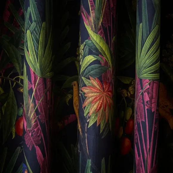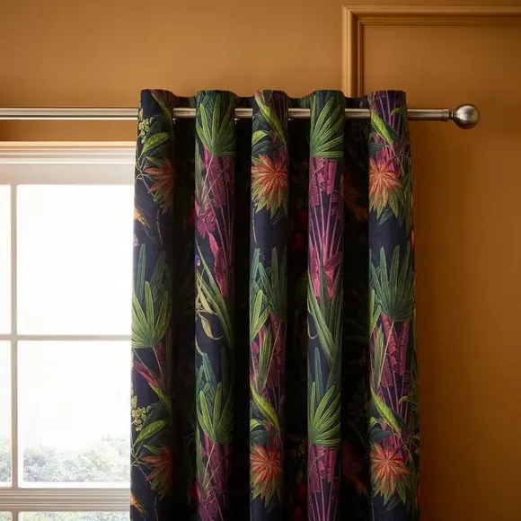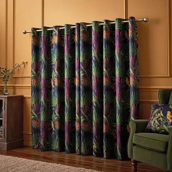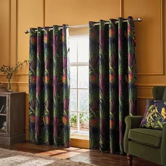 The eyelet curtains feature a striking tropical print with birds and butterflies among lush foliage, crafted from luxurious velour-style fabric. Made from 100% recycled polyester with full lining, they provide enhanced support and durability. The brushed steel eyelets offer smooth operation, while the rich velour finish adds texture and depth. Each set includes two curtain panels designed for easy hanging and long-lasting performance.
